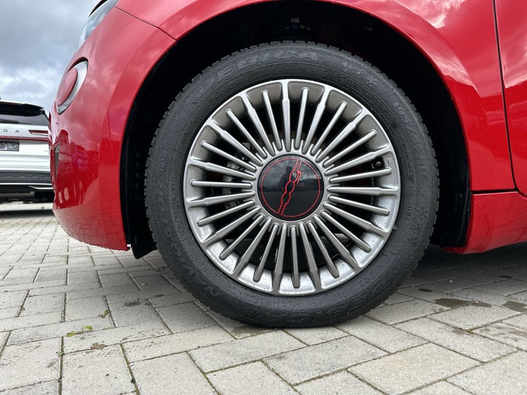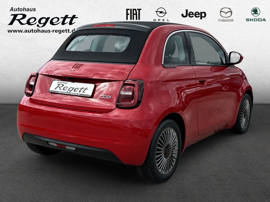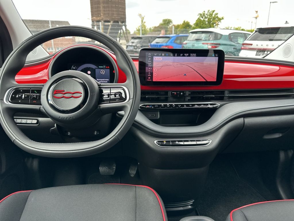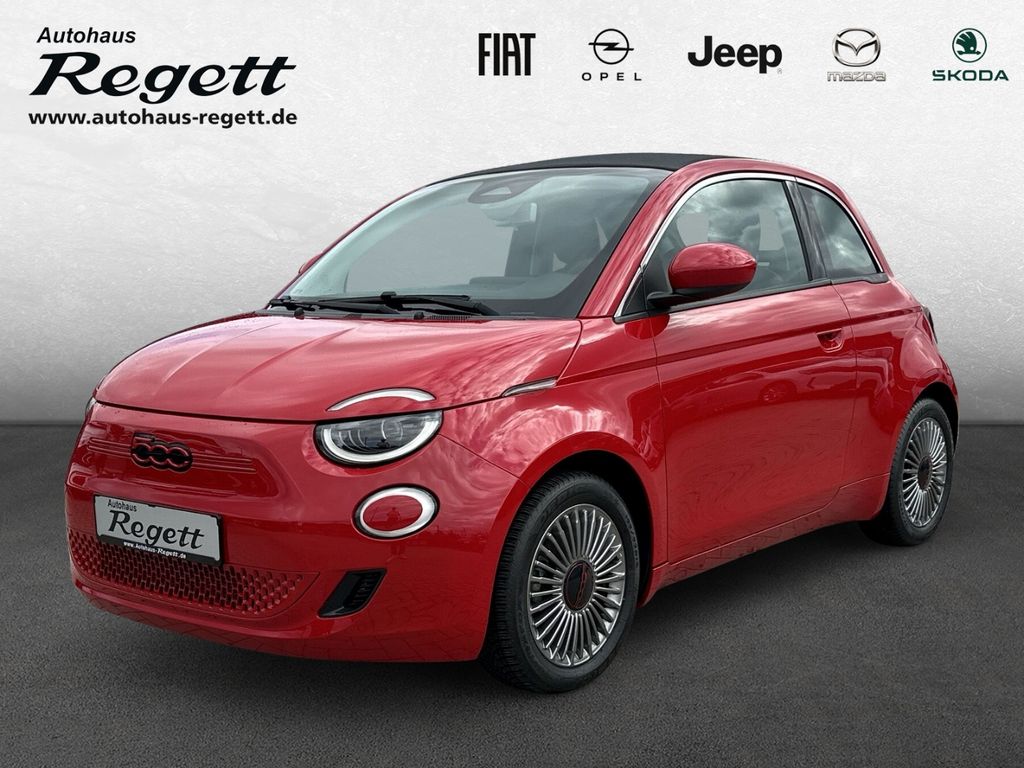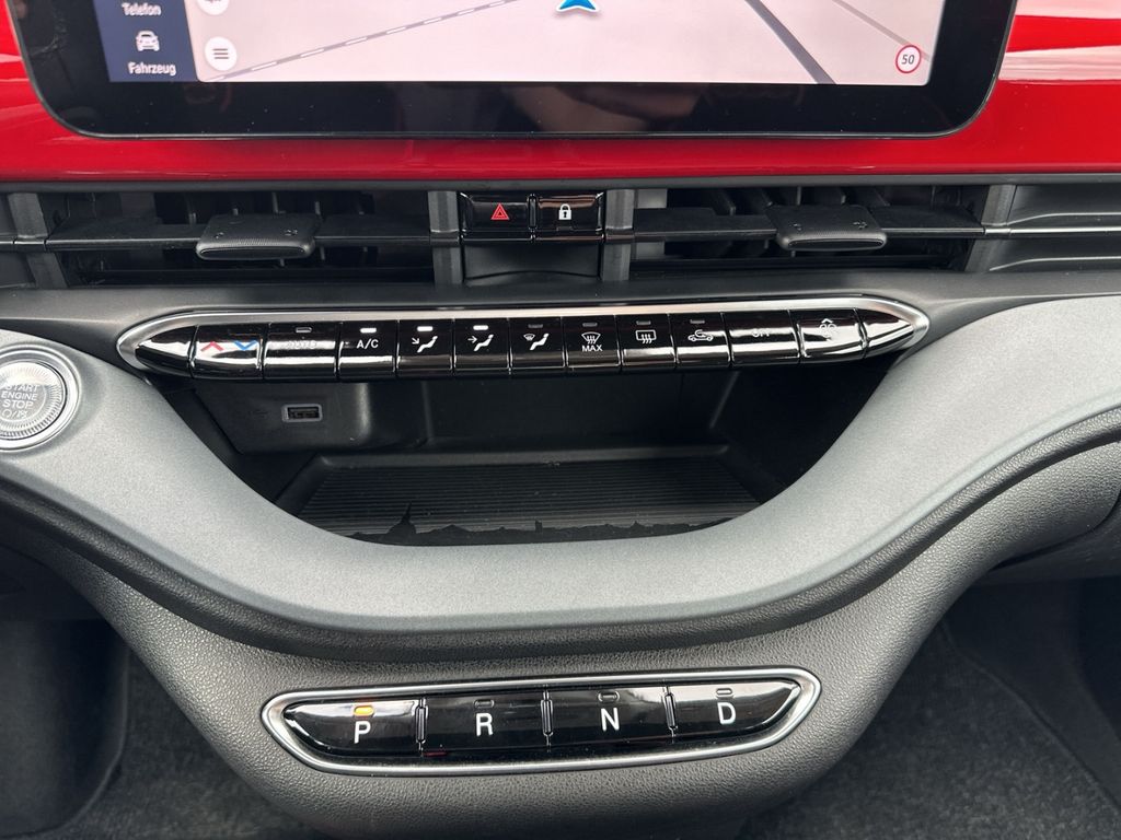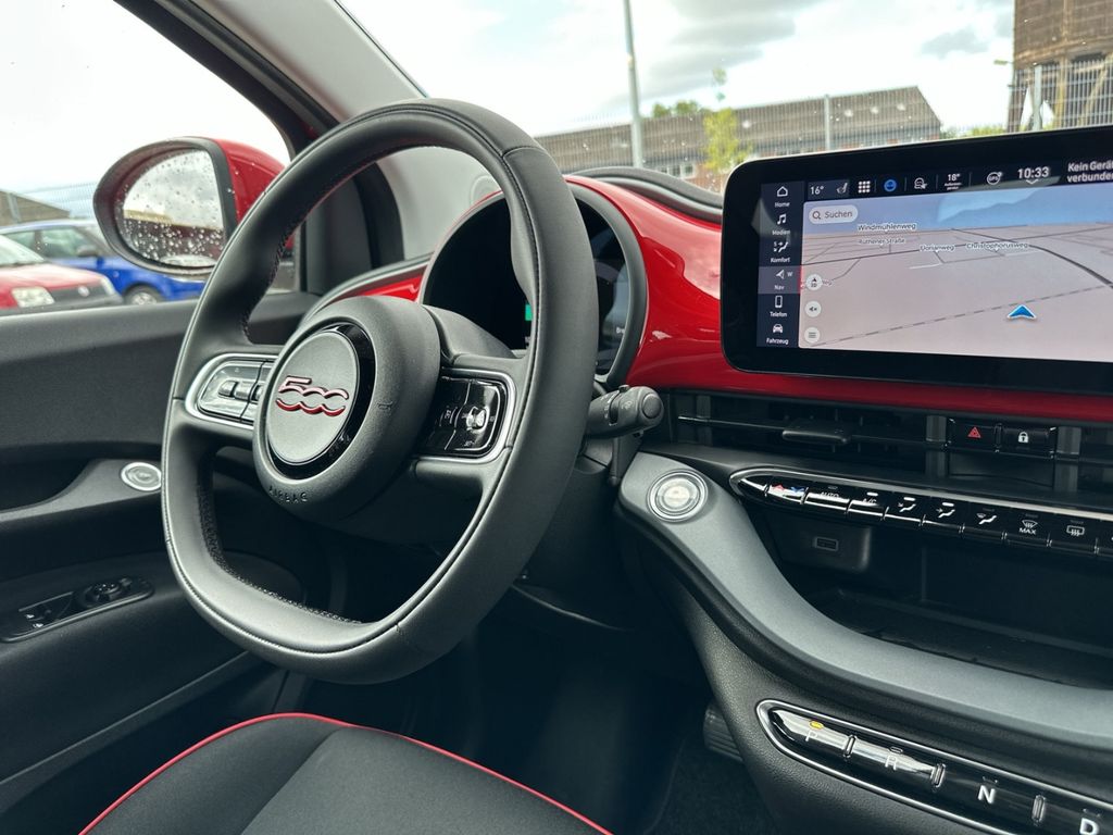 - Weiteres: Antriebs-Schlupfregelung (ASR), Sitzbezug / Polsterung: Stoff, Heckleuchten LED, Ambiente-Beleuchtung, Einparkhilfe hinten, Fernbedienung für Zentralverriegelung und Verdeck, Armaturenbrett farbig, Sonderlackierung Rot, Elektromotor 70 kW (cont. 43 kW), Beifahrerairbag abschaltbar, Fahrmodusschalter, Geschwindigkeits-Regelanlage (Tempomat), Heckscheibe heizbar, Infotainment-System: UConnect 5 mit Navigationssystem, DAB+ und Bluetooth-Freisprecheinrichtung (Touchscreen 10,25 Zoll), Kopfstützen hinten, Memoryfunktion für Sitz vorn links, Smartphone Schnittstelle (Apple CarPlay & Android Auto), Wärmeschutzverglasung, Regen-/Lichtsensor, Sitzheizung vorn, Tagfahrlicht LED, USB-Schnittstelle, Airbag Fahrer-/Beifahrerseite, Elektron. Stabilitäts-Programm (ESP / ESC), Kopf-Airbag-System vorn, Lenksäule (Lenkrad) höhenverstellbar, Notrufsystem (eCall), Seitenairbag vorn, Fensterheber elektr. vorn mit Komfortschaltung, Antriebsart: Frontantrieb, Aufmerksamkeits-Assistent, Autom. Begleitfunktion der Beleuchtung (Follow me home), Autonomer Notbrems-Assistent (AEB), Bremsassistent, Fensterzierleisten verchromt, Handschuhfach beleuchtet, Induktionsladeschale für Smartphone, Keyless-Entry & Go, Klimaautomatik, Mobile Online Dienste UConnect Live, One Pedal Drive (elektronisches Gaspedal), Parkbremse elektrisch, Radioempfang digital (DAB+), Rückfahrkamera Park View, Scheibenwischer beheizbar, Spurhalteassistent, Verdeckbezug Stoff schwarz, Verkehrszeichenerkennung, Winter-Paket
