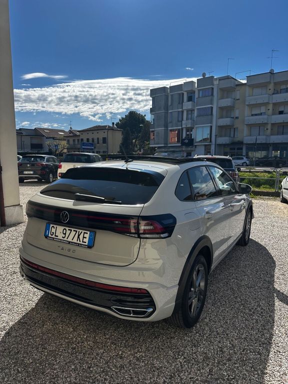 Volkswagen Taigo 1.0 TSI 110 CV DSG R-LineEQUIPAGGIATA CON: ALLESTIMENTO RLINE, SPECCHIETTI ELETTRICI, INTERNI IN STOFFA E ALCANTARA, LUCI DURNE LED, LUCI POSTERIORI LED, MODANATURE NERO LUCIDO, VETRI PRIVACY POSTERIORI, SISTEMA ANTICOLLISIONE, RILEVATORE SEGNALI STRADALI, ANDROIDAUTO APPLECARPLAY, VIVAVOCE, NAVIGATORE, BRACCIOLO, CAMBIO SEQUENZIALE AL VOLANTE, FARI FULL LED, VOLANTE IN PELLE, CRUISE CONTROL, VIRTUAL COCKPIT, CERCHI IN LEGA BRUNITI 17', FENDINEBBIA, PORTAPACCHI, SENSORI DI PARCHEGGIO 360°, TETTO PANORAMICO APRIBILE, VETRI ELETTRICI, SPECCHIETTI ELETTR.RICHIUDIBILI.