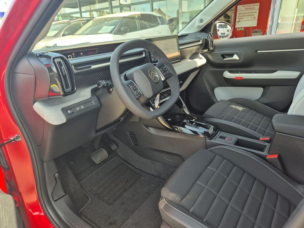 - Weiteres: Antriebs-Schlupfregelung (ASR), Reifendruck-Kontrollsystem, Rückfahrkamera, Isofix-Aufnahmen für Kindersitz an Rücksitz, Scheibenwischer mit Regensensor, Head-up-Display, Dachreling, Seitenscheiben hinten und Heckscheibe dunkel getönt, Einschaltautomatik für Fahrlicht, LM-Felgen, Navigationssystem: NaviDrive 3D, Fahrmodusschalter, Touchscreen-Farbdisplay (10,25 Zoll), Zentralverriegelung mit Fernbedienung, Comfort Federung (Citroen Advanced), Rücksitzbank klappbar 1/3-2/3, USB-/Audio-Schnittstelle (Typ C), Audiobedienung am Lenkrad, Geschwindigkeits-Regelanlage (Tempomat) inkl. Geschwindigkeits-Begrenzeranlage, USB-/Audio-Schnittstelle (Typ C, 2-fach), Fensterheber elektrisch hinten, Lenkrad (Spaltleder), Fahrassistenz-System: Aktiver Notbrems-Assistent (Frontradar-Assistent), Außenausstattung: Farbclips in Gelb, Elektromotor 83 kW (cont. 53 kW), Fernbedienung für Zentralverriegelung, Einparkhilfe hinten, Audio-Navigationssystem: 3D Navigation mit 10,25 Zoll Touchscreen, Reifen-Reparaturkit, Sonderlackierung Elixir-Rot Metallic, Airbag Fahrer-/Beifahrerseite, Tagfahrlicht LED, Fensterheber elektrisch vorn, Seitenairbag vorn, Kopf-Airbag-System, Anti-Blockier-System (ABS), Heckleuchten LED, 3D-Optik, Zentralverriegelung inkl. Türverriegelung automatisch, 12V-Steckdose, Akustischer Fußgängerschutz, Allwetter-/ Ganzjahresreifen, Aufmerksamkeits-Assistent (Müdigkeitserkennungs-Sensor), Außenspiegel elektr. anklappbar, Beifahrerairbag abschaltbar, Berganfahrhilfe, Bremsassistent, Bremsenergierückgewinnung, Connecting-Box, Dach Wagenfarbe, Elektr. Bremskraftverteilung, Elektron. Stabilitäts-Programm (ESP), Freisprechanlage Bluetooth, Induktionsladeschale für Smartphone, Innenausstattung: Ambiente Metropolitan Grey, Innenspiegel mit Abblendautomatik, Klimaautomatik, Parkbremse elektrisch, Polster: Stoff/Kunstleder, Radioempfang Digital (DAB), Radioempfang digital (DAB+), Scheinwerfer Eco-LED, Sicherheits-Paket, Smartphone Schnittstelle, Spurassistent (AFIL), Verkehrszeichenerkennung, Warnanlage für Sicherheitsgurte