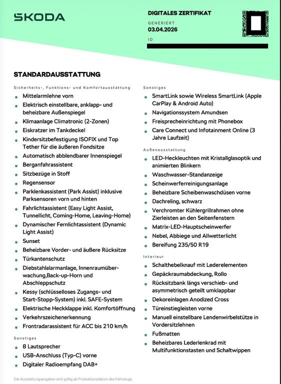 Sehr hochwertige Ausstattung (laut digitalem Zertifikat):