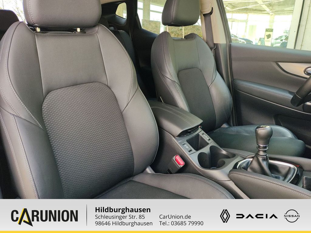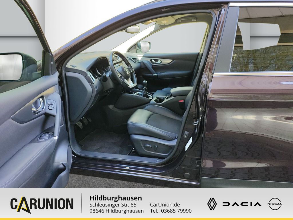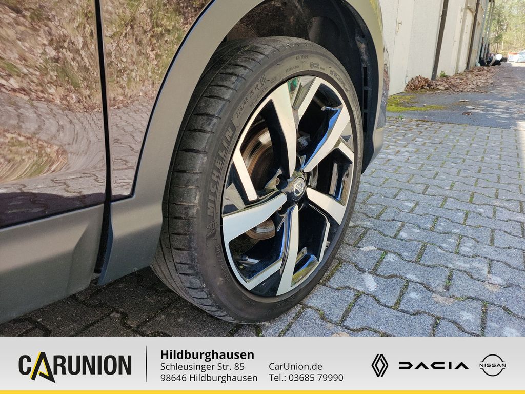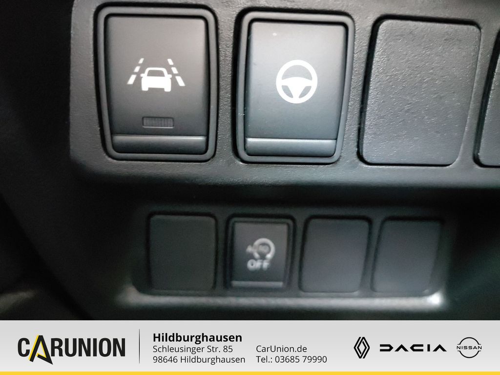 Frontscheibe heizbar, Metallic-Lackierung, 3. Bremsleuchte, 6 Lautsprecher, Airbag Beifahrerseite abschaltbar, Airbag Fahrer-/Beifahrerseite und Seitenairbag vorn, Ambiente-Beleuchtung, Anti-Blockier-System (ABS), Antriebsart: Frontantrieb, Audiobedienung am Lenkrad, Audiosystem: Radio mit CD- und MP3-Player, Touchscreen-Farbdisplay (7.0 Zoll) in Mittelkonsole, Außenspiegel elektr. anklappbar, Außenspiegel elektr. verstell- und heizbar, Außenspiegel Wagenfarbe, Außentemperaturanzeige, Ausstattungs-Paket: Nissan Connect, Kamerasystem Around View, Navigationssystem, Auto-Hold-Funktion, Automatische Fahrlichtschaltung, AUX-IN-Anschluss (AUX-IN), Blinkleuchte in Außenspiegel integriert, Bluetooth-Schnittstelle, Bordcomputer, Bremsassistent (Nissan Brake-Assist), Coming-Home-Lichtfunktion (Friendly Lightning), Dachreling silber, Elektr. Bremskraftverteilung (EBD), Elektron. Stabilitäts-Programm (ESP), Fahrassistenz-Paket, Einparkhilfe hinten, Einparkhilfe vorn, Fahrassistenz-System: Autonomer Notbrems-Assistent, Fahrassistenz-System: Fußgängererkennung, Fahrassistenz-System: Spurhalteassistent, Fahrassistenz-System: Verkehrszeichenerkennung, Innenspiegel mit Abblendautomatik, Fahrassistenz-System: Aktive Fahrkomfortregelung (Fahrwerksdämpfung), Fahrassistenz-System: Aktive Motorbremse, Fahrassistenz-System: Fernlichtassistent, Fahrassistenz-System: Geschwindigkeits-Warnanlage akustisch (Speed-Limiter), Fahrassistenz-System: Kurvenbremskontrolle (Aktive Spurkontrolle), Fahrer-Informations-System (FIS) mit Farbdisplay, Fensterheber elektrisch vorn + hinten, Fernentriegelung Tankklappe, Freisprechanlage Bluetooth, Frontscheibe Verbundglas, Gepäck-/Laderaum-Unterteilung (Flexi-Board), Gepäckraumabdeckung / Rollo, Geschwindigkeits-Regelanlage (Tempomat), Getränkehalter in Mittelkonsole, Getriebe 6-Gang, Gurtstraffer, Handschuhfach beleuchtet, Heckscheibe heizbar, Innenraumfilter: Pollenfilter, Isofix-Aufnahmen für Kindersitz, Karosserie: 5-türig, Klimaautomatik 2-Zonen, Kopf-Airbag-System, Kopfstützen vorn und hinten verstellbar, Lendenwirbelstütze Sitz vorn links, Lenkrad (Leder), Lenkrad mit Multifunktion, Lenksä
