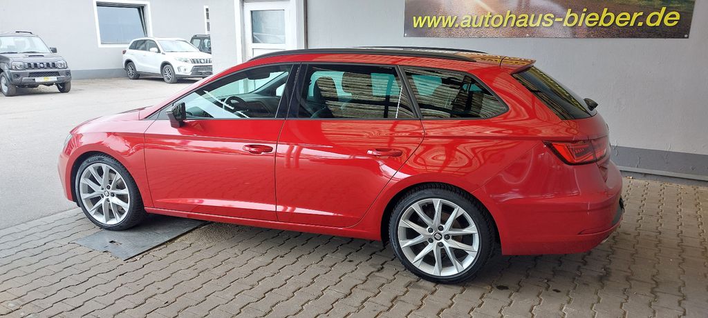 Entdecken Sie diesen gepflegten SEAT Leon Kombi aus dem Jahr 2019 mit nur zwei Vorbesitzern. Der 1,5-Liter-Benzinmotor mit 150 PS bietet dank Frontantrieb und Automatikgetriebe ein dynamisches Fahrerlebnis bei gleichzeitig niedrigem Verbrauch. Die rote Außenlackierung in Kombination mit der schwarzen Stoffausstattung verleiht dem Fahrzeug einen sportlichen Charakter.Dieser Leon überzeugt mit umfangreicher Ausstattung für Komfort und Sicherheit: Automatische Klimaanlage, beheizbare Sitze, Panoramaglasdach, Dachreling und Sportssitze sorgen für angenehme Fahrten. Das digitale Cockpit und Navigationssystem mit Apple CarPlay bieten modernste Konnektivität. Parksensoren vorne und hinten sowie Rückfahrkamera erleichtern das Rangieren.