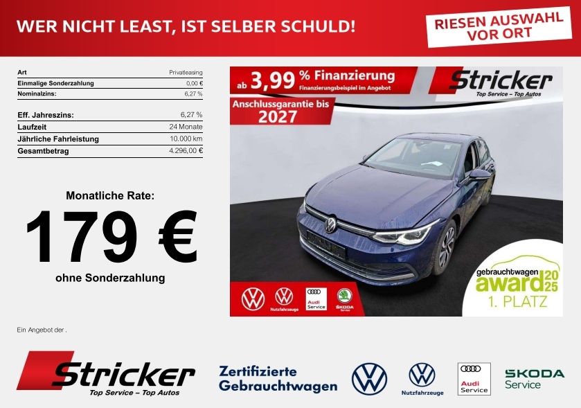 Scheckheftgepflegt; Anschlussgarantie, Laufzeit 3 Jahre im Anschluss an die Herstellergarantie, maximale Gesamtlaufleistung 100.000 km; Abbiege- und Schlechtwetterlicht; Fahrlichtschaltung automatisch, mit LED-Tagfahrlicht sowie Begrüßungs- und Verabschiedungslicht; Vordersitze und äußere Rücksitze beheizbar; Standheizung und -lüftung mit Vorwahluhr und Fernbedienung; Mit Verkehrszeichenerkennung; Fernlichtassistent "Light Assist"; Müdigkeitserkennung; Rückfahrkamera "Rear View"; Automatische Distanzregelung ACC "stop & go", mit Geschwindigkeitsbegrenzer; Navigationssystem "Discover Pro" inkl. "Streaming & Internet"; Fahrassistent "Travel Assist" und Spurhalteassistent "Lane Assist"; Parklenkassistent "Park Assist" inkl. Einparkhilfe; Multifunktionslenkrad in Leder, beheizbar; Telefonschnittstelle "Comfort" mit induktiver Ladefunktion; 2 USB-C-Schnittstellen vorn, 2 USB-C-Ladebuchsen an der Mittelkonsole hinten; Ladeleistung bis zu 45 W; Klimaanlage "Air Care Climatronic" mit Aktiv-Kombifilter, Bedienelementen hinten und 3-Zonen-Temperaturregelung; Lendenwirbelstützen vorn; Digital Cockpit Pro, mehrfarbig, verschiedene Info-Profile wählbar; App-Connect inkl. App-Connect Wireless für Apple CarPlay und Android Auto; Außenspiegel elektrisch einstell- und beheizbar, mit Memory-Funktion und Beifahrerspiegelabsenkung; Head-up-Display; Ambientebeleuchtung 30-farbig; "IQ.DRIVE"-Paket ohne anklappbare Außenspiegel; Details zur Finanzierung unten im Inserat! Sie möchten eine Anzahlung leisten, Ihr altes Fahrzeug eintauschen oder haben eine abweichende jährliche Fahrleistung? Alles kein Problem, wir machen Ihnen gerne ein Angebot!