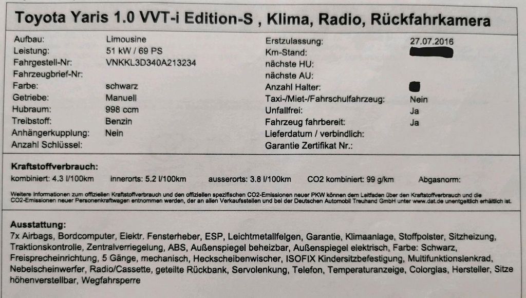 Zum Verkauf steht ein stets zuverlässiger Toyota Yaris, Bj. 07/2016 mit sparsamen und dank Steuerkette recht wartungsarmen 3 Zylinder Motor und 116.000 km Laufleistung. Wegen Umstieg auf E-Mobilität ist das Fahrzeug mit HU/AU bis 08/2027 abzugeben. Fahrzeug ist mit Allwetterreifen ausgestattet.Pollenfilter gewechselt bei 84.000 km