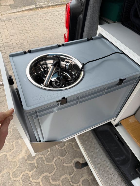- Heckküche mit Stauraum, Spüle(akkubetrieben) und Kühlbox(Kompressor)