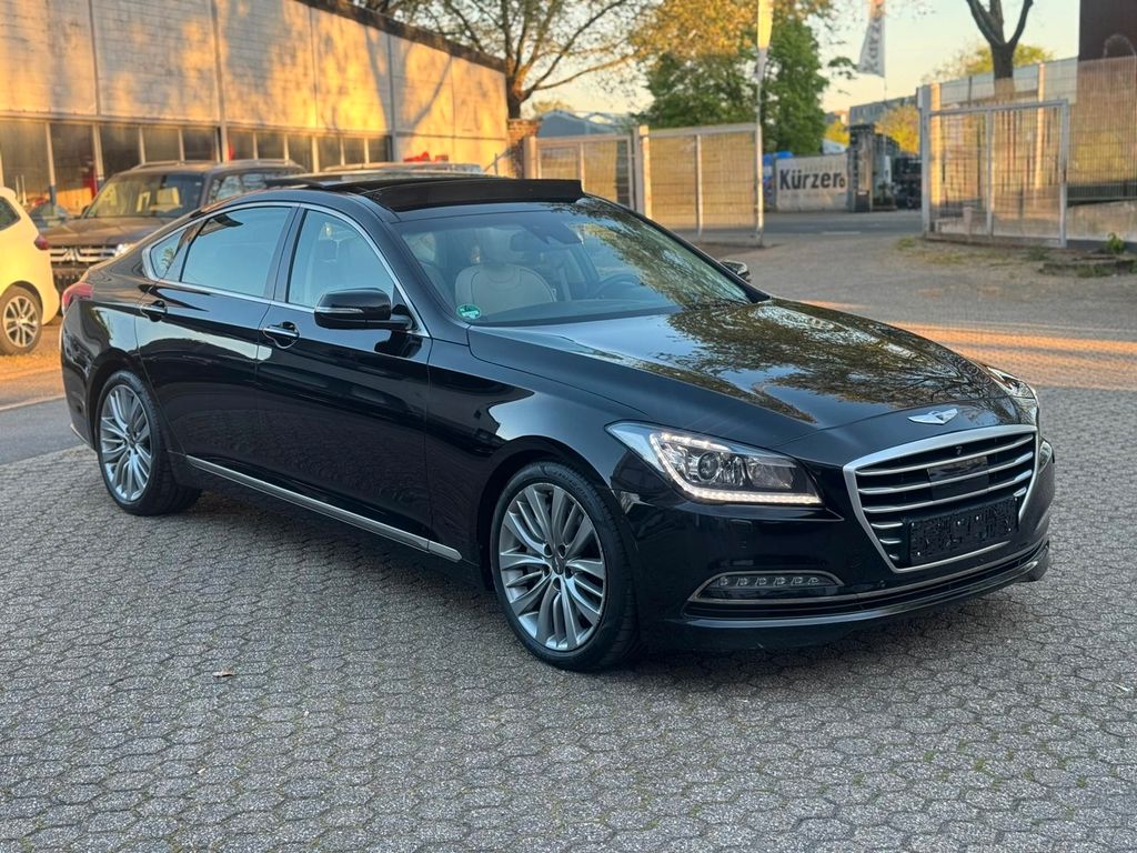 Weitere Ausstattung:3. Bremsleuchte, Airbag Beifahrerseite, Airbag Beifahrerseite abschaltbar, Airbag Fahrerseite, Aktive Motorhaube, Aktive Sicherheitsgurte vorn, Ambiente-Beleuchtung, Antriebsart: Allradantrieb, Audio-/Radio-Fernbedienung am Lenkrad, Audio-Navigationssystem, Außenspiegel elektr. anklappbar, Außenspiegel elektr. verstell- und heizbar, beide, Außenspiegel elektr. verstell- und heizbar, mit Memory, Außenspiegel lackiert, Außenspiegel mit Abblendautomatik, Außenspiegel mit Umfeldleuchte, Außentemperaturanzeige, Bi-Xenon-Scheinwerfer, Blinkleuchte in Außenspiegel integriert, Bordcomputer, Bremsassistent, Bremslicht mit Notfallfunktion (Einschaltautomatik Warnblinkanlage), Doppelendrohr Auspuffanlage, Einschaltautomatik für Fahrlicht / Lichtsensor, Einstiegsbeleuchtung, Elektron. Stabilitätskontrolle (ESC) mit Bremsassistent, Fahrassistenz-System: Berganfahrhilfe, Fahrassistenz-System: Einpark-Assistent, Fahrassistenz-System: Einparkhilfe vorn und hinten, Fahrassistenz-System: Fahrprofilauswahl (Drive Mode), Fahrassistenz-System: Fernlichtassistent, Fahrassistenz-System: Querverkehrs-Assistent Heck (Cross Traffic), Fahrassistenz-System: Smart-Parking-System, Fahrassistenz-System: Spurhalteassistent, Warnsystem (LDWS, Lane Departure Warning System), Fahrassistenz-System: Überschlag-Schutzsystem, Fahrer-Informations-System, Fahrwerksdämpfung elektronisch geregelt (ASD / ECS), Fensterheber elektrisch vorn + hinten, Freisprecheinrichtung Bluetooth, Geschwindigkeits-Regelanlage (Tempomat) mit Abstandsregelung ACC, Getränkehalter vorn, Handschuhfach beleuchtet, Handschuhfach mit Kühlfunktion, Head-up-Display, Heckklappenbetätigung elektrisch, Heckleuchten LED, Heckscheibe heizbar, Innenspiegel mit Abblendautomatik, Isofix-Aufnahmen für Kindersitz, Kamerasystem Around View, Karosserie: 4-türig, Klimaautomatik 3-Zonen, Knieairbag, Komfortsitze hinten (inkl. Belüftung und Sitzheizung), Komfortsitze vorn (inkl. Belüftung / Sitzheizung), Kopf-Airbag-System, Kühlergrill mit Chromrand, Lenkrad heizbar, Lenkrad mit Schaltwippen, Lenksäule (Lenkrad) elektr. verstellbar, Leseleuchte, Leuchtweitenregelung automatisch, LM-Felgen, Metallic-Lackierung, Mittelarmlehne hinten mit Getränkehalter, Motor 3,8 Ltr. - 232 kW V6 GDI KAT, Multifunktionsarmlehne im Fond, Nebelscheinwerfer LED, Panorama-Schiebedach, Parkbremse elektrisch (EPB), Reifendruck-Kontrollsystem, Rückfahrkamera, Rücksitzbank / Rücksitzlehne geteilt, Schadstoffarm nach Abgasnorm Euro 5, Scheibenantenne, Scheibenwischerenteiser vorn, Seitenairbag hinten, Seitenairbag vorn, Seitenaufprallschutz, Sitze vorn elektr. verstellbar (links mit Memory), Soft-Close-Automatik für Türen, Sonnenschutzrollo an Heckscheibe elektrisch, Sonnenschutzrollo an Türscheiben hinten, Sound-System, Start-Stop-Knopf, Traktionskontrolle (TCS), Türgriffe außen Wagenfarbe (mit Chromleiste), USB-Anschluss + AUX-IN-Anschluss