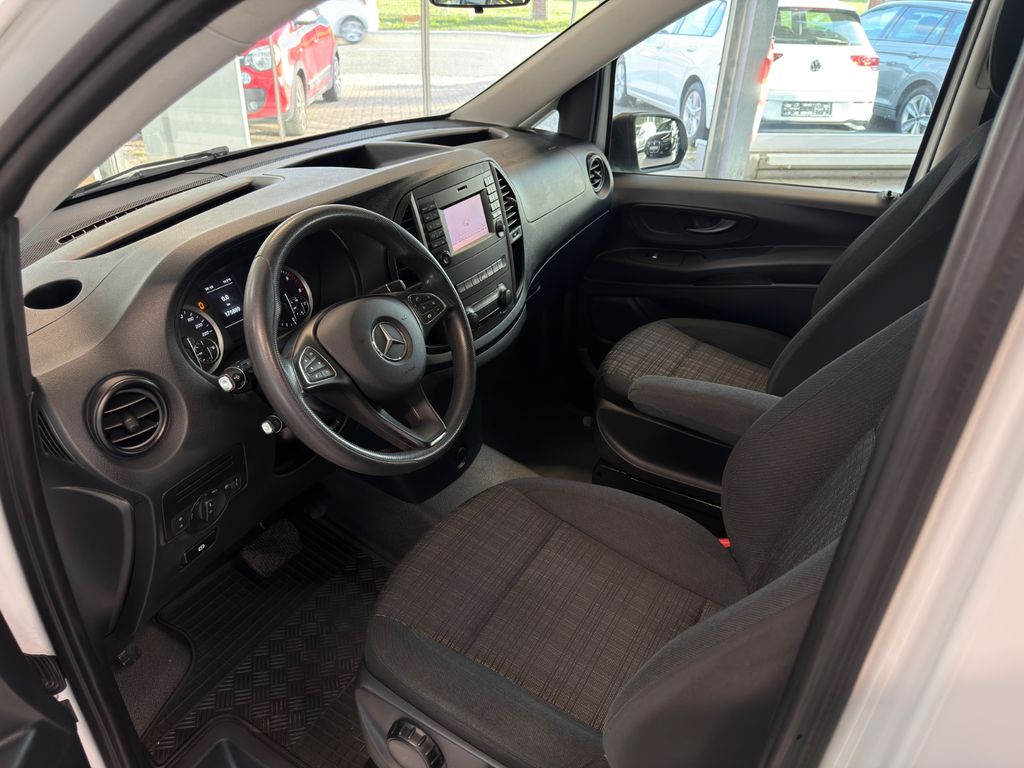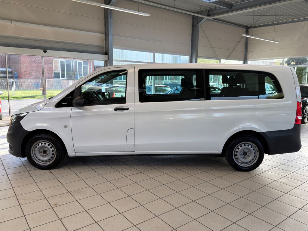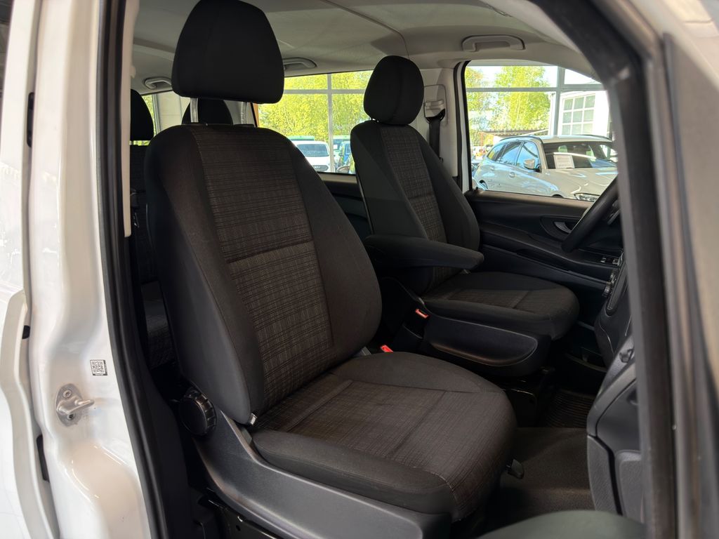 3. Bremsleuchte, Adaptives Bremslicht, Airbag Beifahrerseite, Airbag Fahrerseite, Anfahrhilfe (Berganfahr-Assistent), Anzeige für Waschwasserstand, Auflastung auf 3,1 t, Außenspiegel asphärisch, beide, Außenspiegel elektr. verstell- und heizbar, beide, Außentemperaturanzeige, Befestigungsschienen für Dachträger, BlueEfficiency-Paket, Bodenbelag: Fahrgastraum TPO, Bremsassistent, Bremssystem mit ABS+ASR, Dachverkleidung, Design- und Ausstattungslinie PRO, Einstiegsgriff hinten, Fahrassistenz-System: Anfahr-Assistent (Berganfahr-Assistent), Fahrassistenz-System: Attention-Assist (Müdigkeitserkennungs-Sensor), Fahrassistenz-System: Pannenmanagement, Fahrassistenz-System: Seitenwind-Assistent, Fenster für hintere Türen / Heckklappe mit Wisch-/Waschanlage, Fenster im Lade-/FG-Raum: - feststehend, hinten, Fenster im Lade-/FG-Raum: - feststehend, vorn links, Fenster im Lade-/FG-Raum: - feststehend, vorn rechts, Frontscheibe mit Scheibenantenne, Generator 150 A, Getriebe Automatik GTronic - (9-Stufen), Getränkehalter vorn, Gurtstraffer, Haltegriffe im Fond, Handschuhfach abschließbar, Harnstofftank (AdBlue): 24 Ltr., Heckklappe mit Verglasung, Heckscheibe heizbar, Heckscheibenwischer, Innenverkleidung gehobene Ausführung, Karosserie/Aufbau: extra lang, Karosserie/Aufbau: Kombi Standard, Kindersicherung, Kommunikationsmodul (LTE) für digitale Dienste, Kopf-Airbag-System (Windowbag), Kopf-Schulter-Airbag (Thoraxbag) Fahrer-/Beifahrerseite, Lenkrad (Lenksäule mech. verstellbar), Mercedes-Benz Notrufsystem, Motor 2,0 Ltr. - 100 kW CDI KAT, Nebelschlussleuchte, PKW-Zulassung, Pro, PTC Heater, Radstand 3430 mm, Reifendruck-Kontrollsystem, Rückspiegel innen, Schadstoffarm nach Abgasnorm Euro 6d-TEMP, Schiebetür Lade-/Fahrgastraum rechts mit Verglasung, SCR-System (AdBlue-Technologie), Sicherheitsgurt-System mit Warnanlage (Fahrer-/Beifahrerseite), Sitzbezug / Polsterung: Stoff, Sitze im Fahrerhaus: Beifahrersitz verstellbar, Sitze im Lade-/FG-Raum: 1.Reihe, 3er-Sitzbank, Klappsitz außen, Sitze im Lade-/FG-Raum: 2.Reihe, 3er-Sitzbank, Vlies-Batterie 92 Ah, Warmluftkanal zum Lade-/Fahrgastraum, Wartungsintervall-Anzeige Assyst, Wärmeschutzverglasung