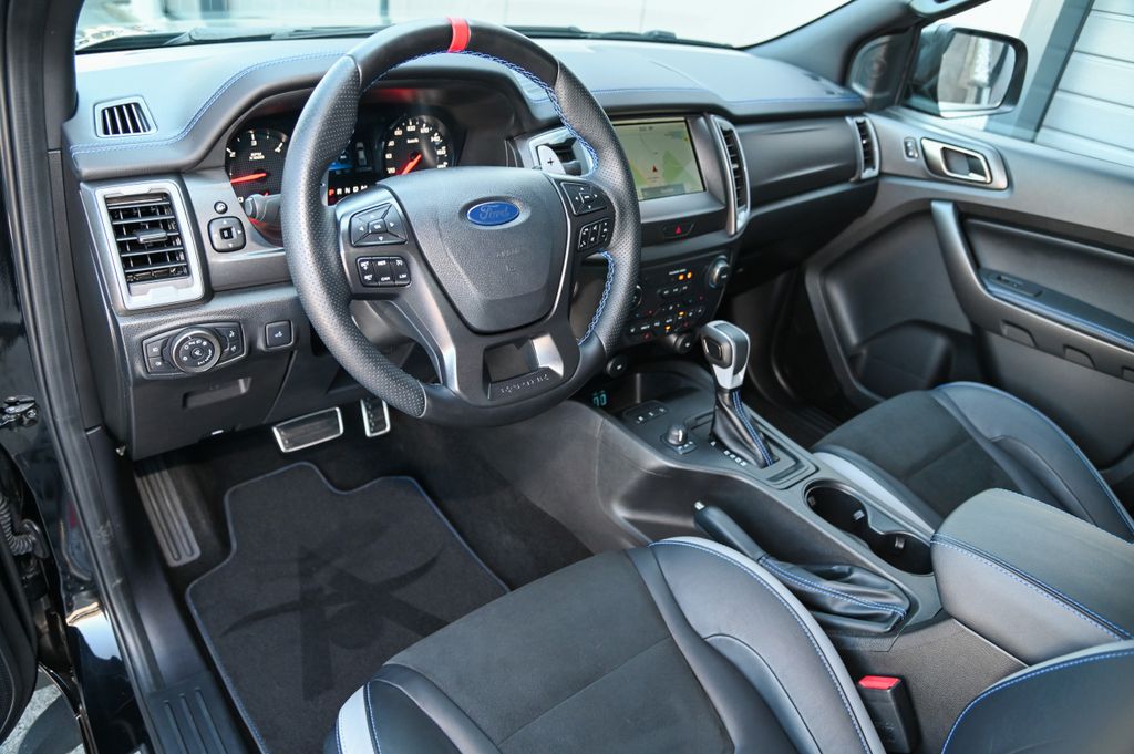 - Blaue Nähte und Leder-Akzente sowie Raptor Logos finden sich auf zahlreichen Elementen des Innenraums