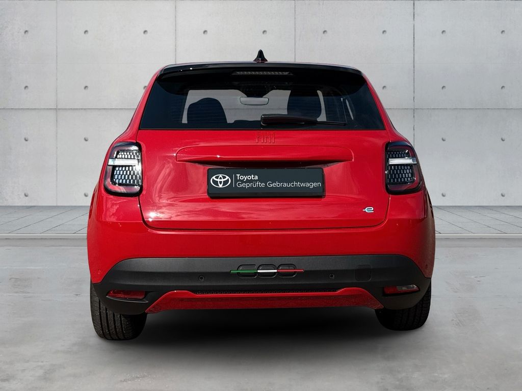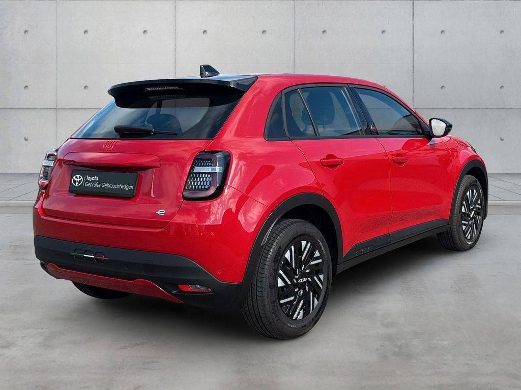 Weitere Ausstattung:Ablagetasche an Vordersitzlehnen, Airbag Beifahrerseite, Airbag Fahrerseite, Ambiente-Beleuchtung, Antriebs-Schlupfregelung (ASR), Außenspiegel elektr. verstellbar, beide, Außenspiegel mit Abdeckkappen schwarz, Einparkhilfe hinten, Elektromotor 115 kW (cont. 62 kW), Fahrassistenz-System: Aufmerksamkeits-Assistent, Fahrassistenz-System: Autonomer Notbrems-Assistent (AEB), Fahrassistenz-System: Spurhalteassistent, Fahrassistenz-System: Verkehrszeichenerkennung, Fahrmodusschalter, Fensterheber elektr. vorn mit Komfortschaltung, Heckleuchten LED, HV-Batterie 54 kWh (Lithium-Ionen), Infotainment-System: UConnect mit DAB+ Radioempfang (Touchscreen 10,25"), Innenausstattung: Dekoreinlagen Armaturenbrett, rot, Instrumentenanzeige Farbdisplay, 7 Zoll, Karosserie: 5-türig, Klimaautomatik, Kopf-Airbag-System vorn und hinten, Kopfstützen hinten, Ladeanschluss 11 kW, Ladekabel mit Typ 2-Stecker (Mode 3), Lenkrad (Soft Touch) mit Multifunktion, Mittelarmlehne vorn, Nebelscheinwerfer LED, One Pedal Drive (elektronisches Gaspedal), Parkbremse elektrisch, Radstand 2562 mm, Rücksitzbank klappbar, Scheibenwischer beheizbar, Scheinwerfer LED, Schnellladefunktion 100 kW, Seitenairbag vorn, Sitz vorn links verstellbar (6-fach), Sitzbezug / Polsterung: Stoff, Sitzverstellung vorn rechts (4-fach), Smartphone Schnittstelle (Apple CarPlay & Android Auto), Sonnenblenden mit Spiegel (beleuchtet), Sound-System mit 4 Lautsprecher, Tagfahrlicht LED, Türgriffe innen verchromt, Uni-Lackierung, USB-Anschlüsse (Typ C und Typ A), Warnanlage für Sicherheitsgurte vorn und hinten
