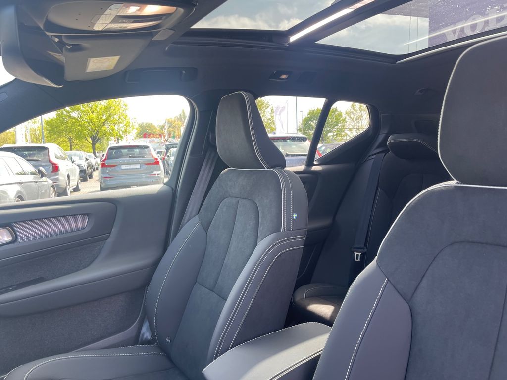Airbag Beifahrerseite, Airbag Beifahrerseite abschaltbar, Airbag Fahrerseite, Ambiente-Beleuchtung erweitert, Anhänger-Stabilisierungs-Programm (TSA) Vorbereitung, Antriebsart: Heckantrieb, Applikationen am Fahrzeugheck Hochglanz-Schwarz, Applikationen an den Seitenfenstern schwarz, hochglänzend, Außen-/Innenspiegel mit Abblendautomatik, Außenspiegel elektr. verstellbar, beide, Außenspiegel heizbar, Außenspiegel schwarz, hochglänzend, Befestigung für Abfallbeutel im Fond, Beinauflage manuell einstellbar, Sitze vorn, Betätigung Heckklappe/-Deckel automatisch, Blinkleuchten LED in Außenspiegel integriert, Convenient Entry & Start, Dach in Kontrastfarbe, Dachreling schwarz, hochglänzend, Dachspoiler Wagenfarbe, Digitale Instrumentierung 12,3"-Display 2. Generation, Durchladeeinrichtung (Mittelarmlehne hinten), Einparkhilfe vorn und hinten (hinten mit Bremsfunktion), Einstiegsleisten mit Schriftzug (Aluminium), Elektromotor 185 kW (cont. 128 kW, Extended Range), Erste Hilfe-Kasten / Verbandkasten, EX40, Fahrassistenz-Paket: Safety Assistance, Fahrassistenz-System: Bergabfahrkontrolle (HDC), Fahrassistenz-System: Berganfahr-Assistent (HSA), Fahrassistenz-System: Intelligent Speed Assist (ISA), Fahrassistenz-System: Multikollisionsbremse (Multi Collision Brake), Fensterheber elektrisch vorn + hinten, Frontstaufach / Frunk (Kofferraum, vorn), Fußraumleuchte vorn, Gepäckraum-Abtrennung (Netz), Gepäckraumboden variabel, Getriebe für Elektrofahrzeug, Getränkehalter in Mittelkonsole, Gurtstraffer, Heckscheibe heizbar, HV-Batterie 82 kWh brutto / 79 kWh netto (Lithium-Ionen), Induktionsladeschale für Smartphone, Infotainment-System: Android (DAB+), Infotainment-System: Android (DAB+) mit Premium Sound (Harman-Kardon), Isofix-Aufnahmen für Kindersitz (Beifahrersitz, Rücksitz), Karosserie: 5-türig, Kindersicherung elektr. betätigt, Klimaautomatik 2-Zonen, Knieairbag Fahrerseite, Kopf-Airbag-System, Kühlergrill schwarz, hochglänzend, Ladekabel (6,0 m) mit Typ 2-Stecker (Mode 3), Lendenwirbelstützen vorn, elektr. verstellbar (4-Wege), Lenkrad (Sport), Lenksäule (Lenkrad) höhen-/längsverstellbar, Leseleuchten vorn und hinten, LM-Felgen, Luftqualitäts-Überwachungssystem erweitert (Clean Zone Interior Package CZIP), Make-up-Spiegel beleuchtet, Metallic-Lackierung, Modellpflege, Motorsound-System (Audible Vehicle Alert System, AVAS), Nebelschlussleuchte, One Pedal Drive (elektronisches Gaspedal), Parkbremse elektrisch, Radstand Standard, Reifen-Reparaturset, Reifendruck-Kontrollsystem, Rückfahrkamera mit 360° Surround View, Rücksitzlehne geteilt/klappbar, Schiebe-/Hebedach elektrisch (Glas), Schleudertrauma-Schutzsystem (WHIPS), Seitenairbag vorn, Service-System: Plug & Charge, Sicherheitsgurte vorn höhenverstellbar, Sitz-Komfort-Paket, Sitzbezug / Polsterung: Connect Textil / Micro-Tech (Ledernachbildung), Sitzheizung vorn, Smartphone Schnittstelle (Apple CarPlay), Standheizung elektrisch, Taschenhaken im Gepäckraum, Textilfussmatten, USB-Anschlüsse, je 2 vorn und hinten, Verglasung getönt, Volvo Car Connect, Volvo Car Connect Plus, Warnanlage für Sicherheitsgurte vorn und hinten, Wärmepumpe zur Reichweitenoptimierung, Regensensor, Sitzheizung vorn