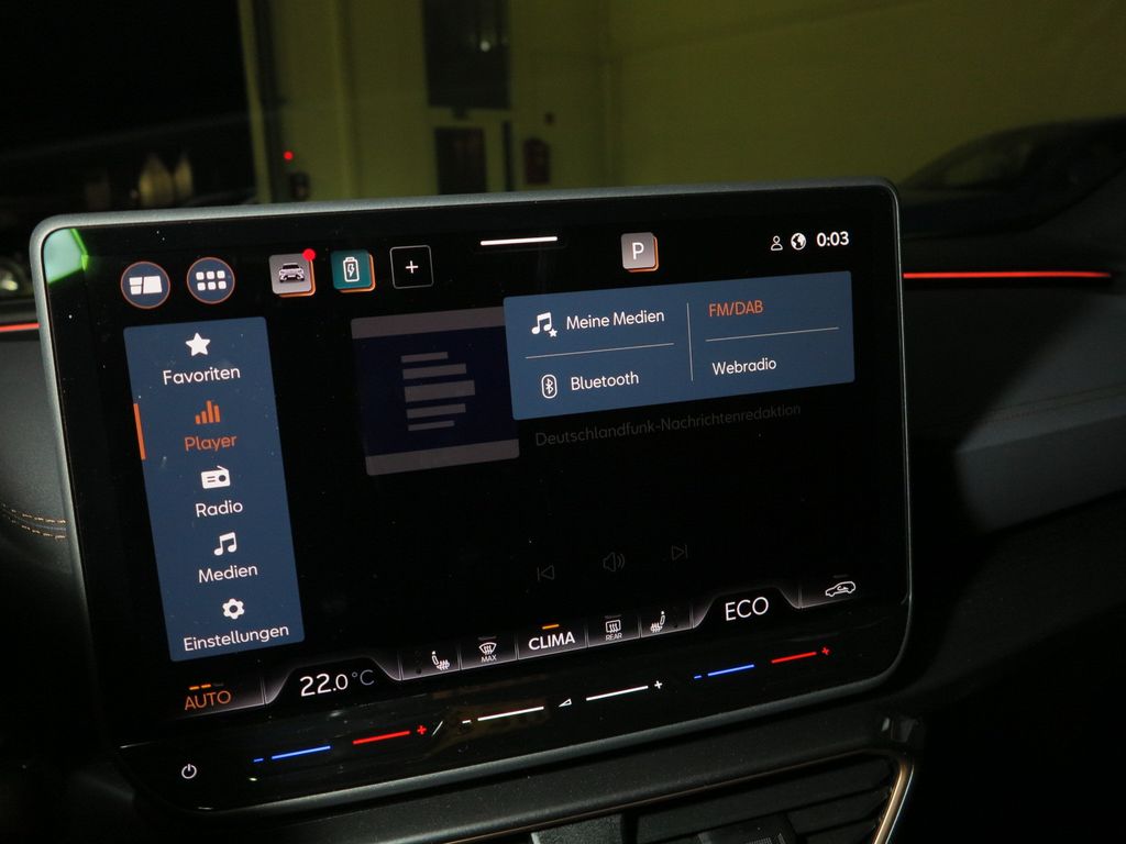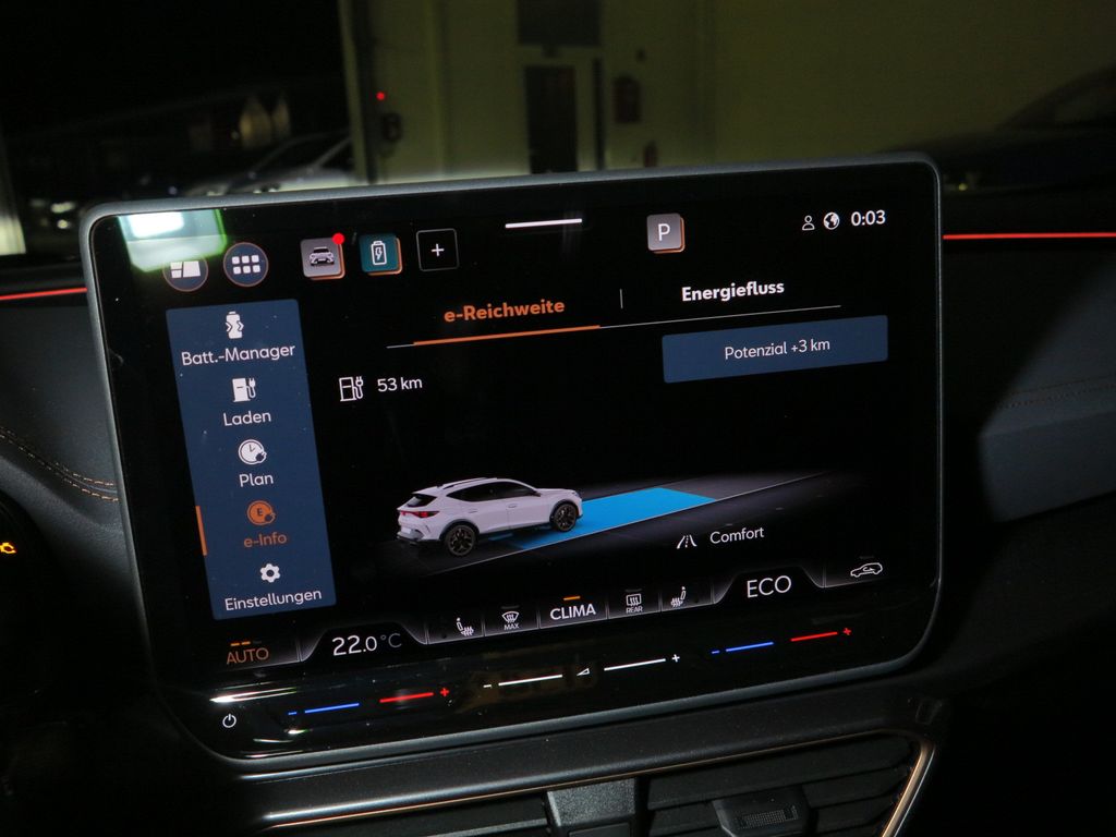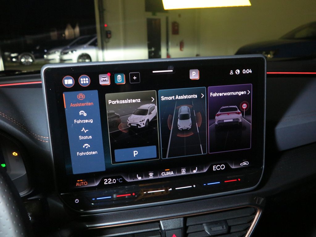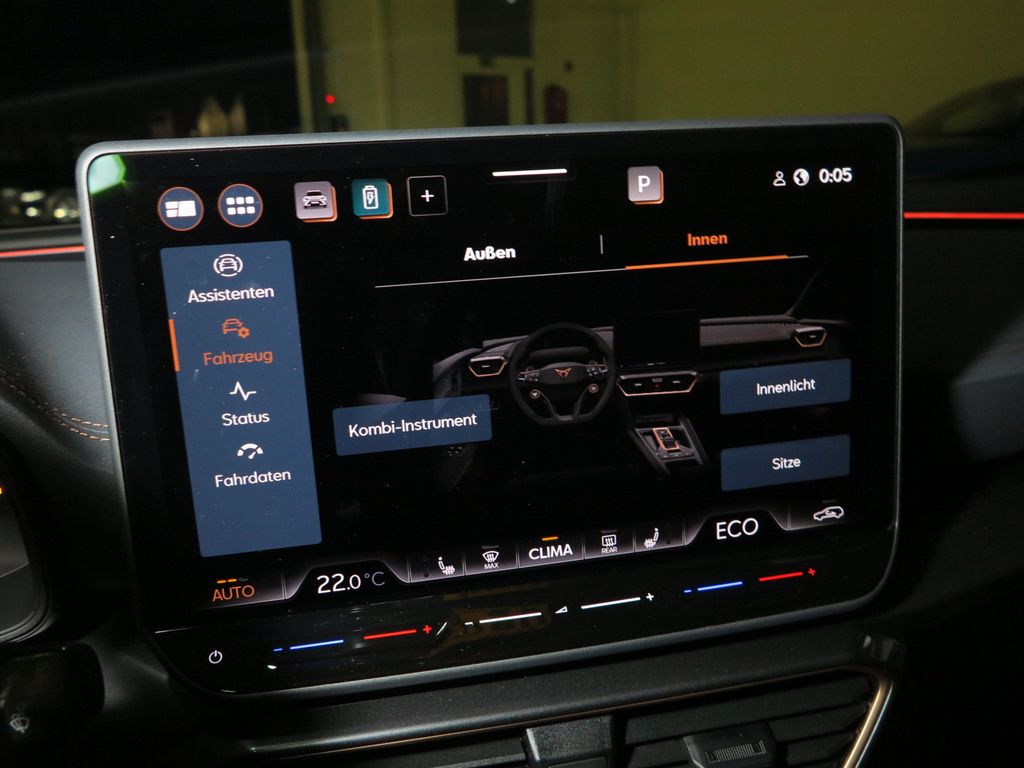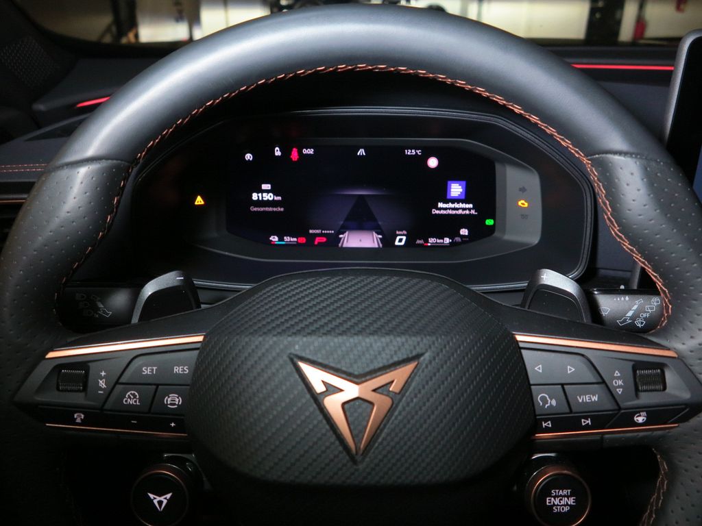 6 Lautsprecher, Abdeckkappen Außenspiegel Schwarz, Airbag Beifahrerseite abschaltbar, Airbag Fahrer-/Beifahrerseite, Außenspiegel elektr. verstell-, heiz- und anklappbar mit Spiegelabsenkung und Welcome Light, Connectivity-Box, Dachhimmel schwarz, Dachreling schwarz, hochglänzend, Differentialsperre (Vorderachse), Edge Paket mit Safesicherung, Einparkhilfe vorn und hinten, Einstiegsleisten vorn beleuchtet, Elektron. Differentialsperre (XDS), Fahrassistenz-System: Adaptive Fahrwerksregelung (DCC), Fahrassistenz-System: Fahrprofilauswahl (CUPRA Drive Profile), Fensterheber elektrisch vorn + hinten mit Komfortschaltung, Fensterzierleisten schwarz, Full Link (MirrorLink, Apple CarPlay und Android Auto), Gepäckraumabdeckung / Rollo, Gepäckraumbeleuchtung (LED), Handschuhfach mit LED-Beleuchtung, Hybrid 200 kW (Motor 1,5 Ltr. - 130 kW TSI eHybrid), Innenausstattung: Interieurleisten Copper, Isofix-Aufnahmen für Kindersitz an Beifahrersitz und Rücksitz (inkl. i-Size-Kindersitze), Karosserie: 5-türig, Klimaanlage Climatronic 3-Zonen, Kombiinstrument digital (virtual cockpit), Kopf-Airbag-System, Kopfstützen hinten (3-fach), Ladekabel mit Schukostecker, Lendenwirbelstütze Sitz vorn links, verstellbar, Lendenwirbelstütze Sitz vorn rechts, verstellbar, Leseleuchten hinten LED, Leseleuchten vorn LED, Licht- und Sicht-Paket, Media-System Plus, Notrufsystem, Otto-Partikelfilter (OPF), Parkbremse elektrisch mit Auto-Hold-Funktion, Radioempfang digital (DAB+), Radstand Standard, Rücksitzlehne geteilt/klappbar mit Mittelarmlehne und Durchladeeinrichtung, Rücksitzlehnen umklappbar mit Fernentriegelung im Kofferraum, Schadstoffarm nach Abgasnorm Euro 6e, Seitenairbag, Seitenairbag vorn mitte (Central Airbag), Seitenscheiben ab 2.Sitzreihe und Heckscheibe dunkel getönt (Privacy Glass), Seitenscheiben hinten und Heckscheibe abgedunkelt, Sitz vorn links höhenverstellbar, Sitz vorn rechts höhenverstellbar, Sonderlackierung Fiord-Blau, Sonnenblende links mit Spiegel (beleuchtet), Sonnenblende rechts mit Spiegel (beleuchtet), Start/Stop-Anlage, Steckdose 230V im Gepäckraum, USB-Ladeanschlüsse (2-fach, Typ C) für 2.Sitzreihe, USB-Schnittstelle vorn (2-fach, Typ C), Verzurrösen Koffer-/Laderaum, Warnanlage für Sicherheitsgurt-System, Wärmeschutzverglasung, Leichtmetallräder, Sitze: Top-Sportsitze vorn, Seitenscheiben hinten und Heckscheibe abgedunkelt