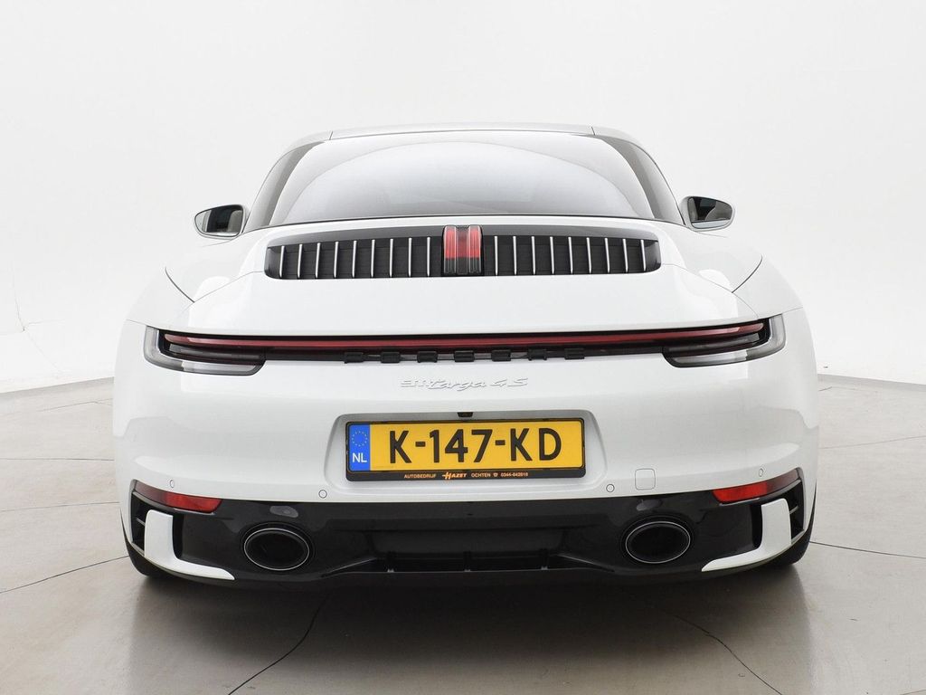 Original Dutch 992 911 Targa 3.0 4S 450 HP PDK automatic in Carrara White metallic with Slate Gray with Chalk leather interior, Four-wheel drive, Only 17,979 km driven, Sports exhaust original from factory, 360-degree camera system, SportDesign bumpers with high-gloss black finish, Bose premium sound, Sport Chrono package, Leather interior parts, Ambient interior lighting, 20-inch alloy wheels wide set (305 rear, 245 front), Heated steering wheel, Red brake calipers, Dark glass rear, Full LED headlights, Wireless Apple Carplay / Android Auto app streaming Google Maps, Flitsmeister, Whatsapp etc, DAB+ Digital radio, PASM adaptive suspension, Cruise control, Partly digital cockpit with navigation map display, Navigation widescreen touch-screen, Seat heating, Electric seat adjustment with memory, Parking sensors, Climate control, Electric spoiler, Porsche projection on the street, Black/gray logo at the front.