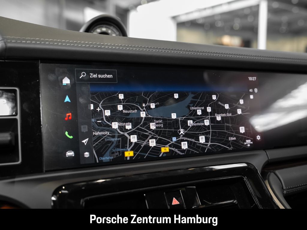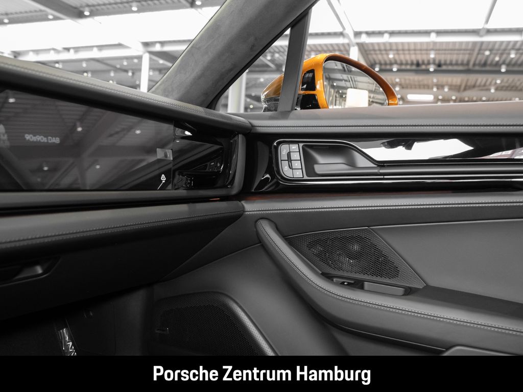 - Weiteres: (3FU) Panorama Dachsystem, (0NC) Modellbezeichnung lackiert in Schwarz (hochglanz), (2D5) SportDesign Paket lackiert in Schwarz (hochglanz), (QJ4) Seitenscheibenleisten in Schwarz (hochglanz), (0N5) Hinterachslenkung, (1P8) Porsche Active Ride. Hinweis: Aktuell eingeschränkte Verfügbarkeit. Bitte informieren Sie sich bei Ihrem Porsche Zentrum., (0P9) Sportabgasanlage inkl. Sportendrohren dunkelbronze, (1LR) Bremssättel lackiert in Schwarz (hochglanz), (1NZ) Räder lackiert in Schwarz (hochglanz) mit glanzgedrehter Stirnfläche, (C9J) 21-Zoll Panamera Turbo S Räder mit Zentralverschluss, (3J3) Porsche Wappen auf Kopfstützen (in Verbindung mit Komfort-Kopfkissen im Fond), (3KK) Komfort-Einzelsitze hinten (8 Wege, elektrisch) mit Memory-Paket, (5TH) Interieur-Paket Aluminium gebürstet in Schwarz, (4D1) Sitzbelüftung vorn und hinten, (GT0) Akzent-Paket schwarz, (QE1) Ablagenpaket, (ALE) Haltegriffe Dachhimmel Race-Tex mit farbigen Ziernähten, (VT9) Türeinstiegsblenden Aluminium gebürstet in Schwarz, beleuchtet, (0TD) Fußmatten, (JH2) Beifahrerdisplay, (8JU) HD-Matrix LED-Hauptscheinwerfer abgedunkelt, (8VQ) Exclusive Design Heckleuchten, (4KF) Privacy-Verglasung, (9R1) Nachtsichtassistent, (GZ2) Soft-Close-Türen, (9AH) 4-Zonen-Klimaautomatik, (2V3) Luftgütesystem, (FT3) Surround View inkl. Aktive Einparkunterstützung, (VC2) Garagentoröffner nach HomeLink® Standard, (3Y8) Sonnenrollo für Fond hinten elektrisch und Sonnenrollos für Fondseitenfenster elektrisch, (QK3) Vorrüstung Porsche Dashcam, (P2C) Porsche InnoDrive inkl. Aktive Spurführung, (4X4) Seiten-Airbags im Fond, (7Y8) Spurwechselassistent