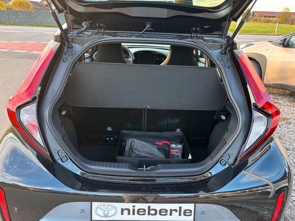 2-Farben-Lackierung Metallic, 3. Bremsleuchte, Airbag Fahrer-/Beifahrerseite, Audiobedienung am Lenkrad, Audiosystem: Multimedia Toyota Touch, Autom. Begleitfunktion der Beleuchtung (Follow me home, FMH), Außenspiegel elektr. verstell- und heizbar, Außenspiegel schwarz lackiert, Design-Paket, Fahrassistenz-System: Eco-Anzeige für verbrauchsoptimiertes Fahren, Fahrassistenz-System: Fernlichtassistent (Abblendautomatik Fahrlicht, AHB), Fahrassistenz-System: Sicherheitssystem Toyota Connect mit automatischem Notruf (eCall), Faltdach, Gepäckraumabdeckung / Rollo, Innenraumfilter: Staub- und Pollenfilter mit Aktivkohlefilter, Isofix-Kindersitz-System, Karosserie: 5-türig, Kindersicherung, Komfort-Paket, Kopf-Airbag-System, Kopfstützen hinten, Lenkrad Applikationen in Pianoschwarz, Lenksäule (Lenkrad) höhenverstellbar, LM-Felgen, Motor 1,0 Ltr. - 53 kW KAT, Multimedia Display (9,0 Zoll), Park-Assistent mit Rückfahrkamera, Reifen-Reparaturkit, Reifendruck-Kontrollsystem, Rücksitz klappbar, Schadstoffarm nach Abgasnorm Euro 6e, Schutzfolie Türgriffmulde, Seitenairbag vorn, Sicht-Paket, Sitz vorn links höhenverstellbar, Sitzheizung vorn, Sonnenblenden mit Make-up-Spiegel, Stop&Go-System (TSGS), Stoßfänger Wagenfarbe, Toyota Safety Sense, Türgriffe außen Wagenfarbe, Türgriffe innen verchromt, Warnanlage für Sicherheitsgurte hinten, Warnanlage für Sicherheitsgurte vorn