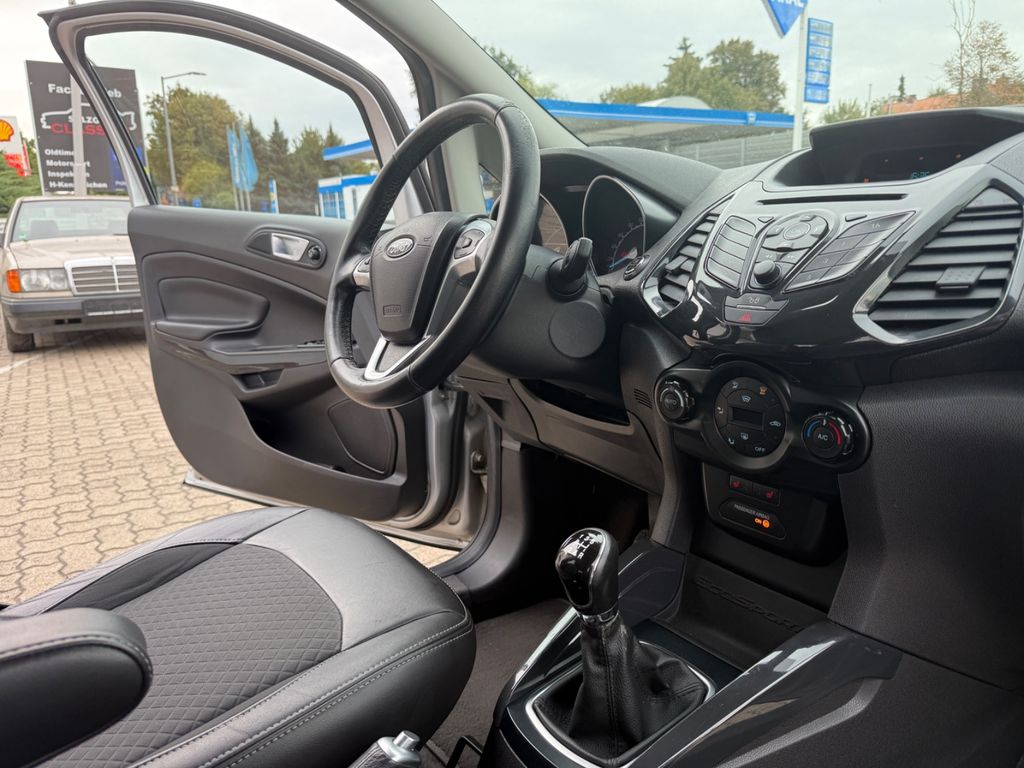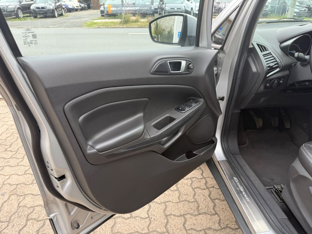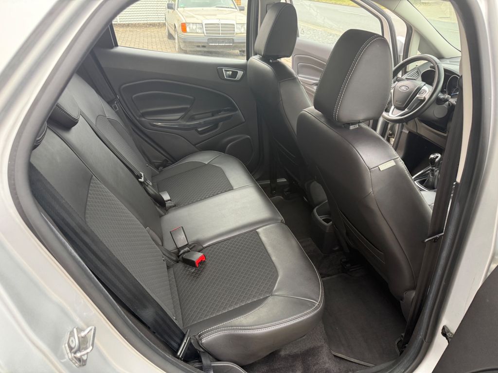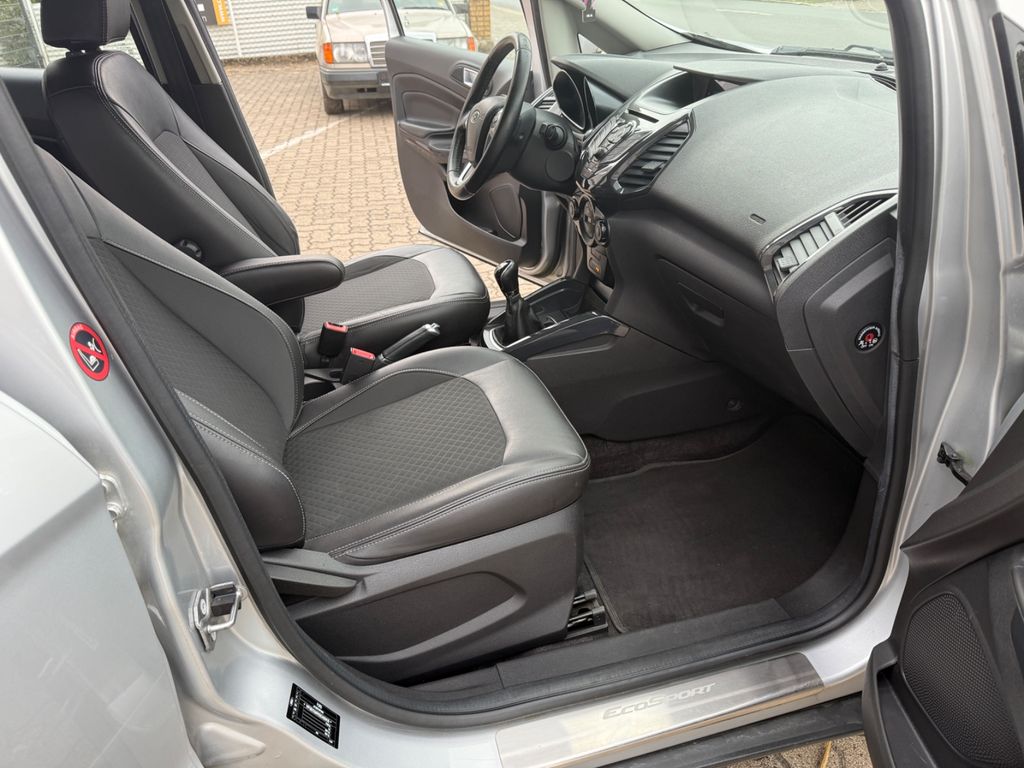 Dieser gepflegte Ford EcoSport präsentiert sich als vielseitiger SUV mit deutscher Zulassung. Der 95 PS starke Dieselmotor mit 1499 ccm Hubraum überzeugt durch seine Wirtschaftlichkeit und erfüllt die Euro 6 Norm. Erstmals zugelassen in 2016, hatte der Fronttriebler nur zwei Vorbesitzer und verfügt über ein lückenloses Scheckheft. Die silberne Metallic-Lackierung harmoniert perfekt mit dem schwarzen Teilledersitzbezug im Innenraum.Für Komfort sorgen die Automatik-Klimaanlage, beheizbare Sitze und Frontscheibe sowie die Regensensor-Automatik und Lichtautomatik. Das Fahrzeug bietet umfassende Sicherheitsausstattung mit Front-, Seiten- und weiteren Airbags, ESP, Berganfahrhilfe und Reifendruckkontrollsystem. Die Einparkhilfe hinten erleichtert das Rangieren im Stadtverkehr.