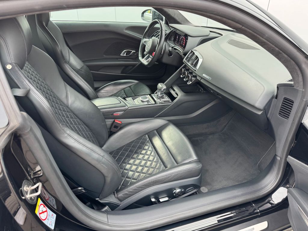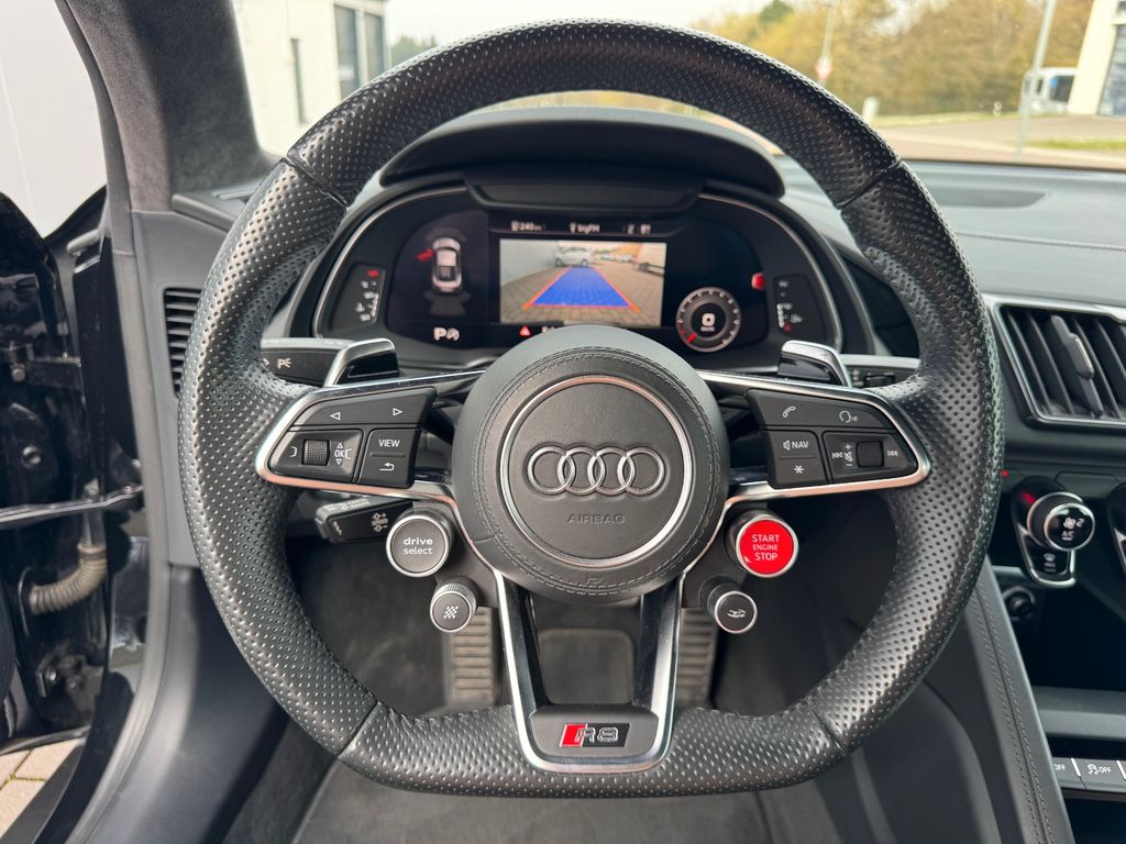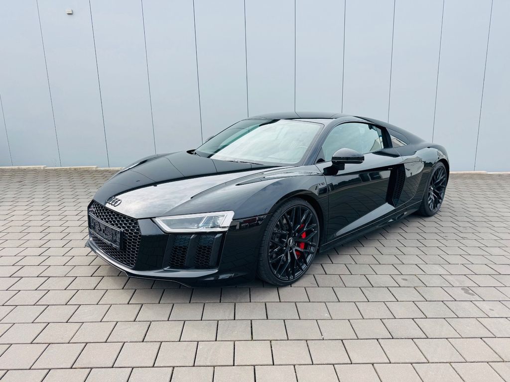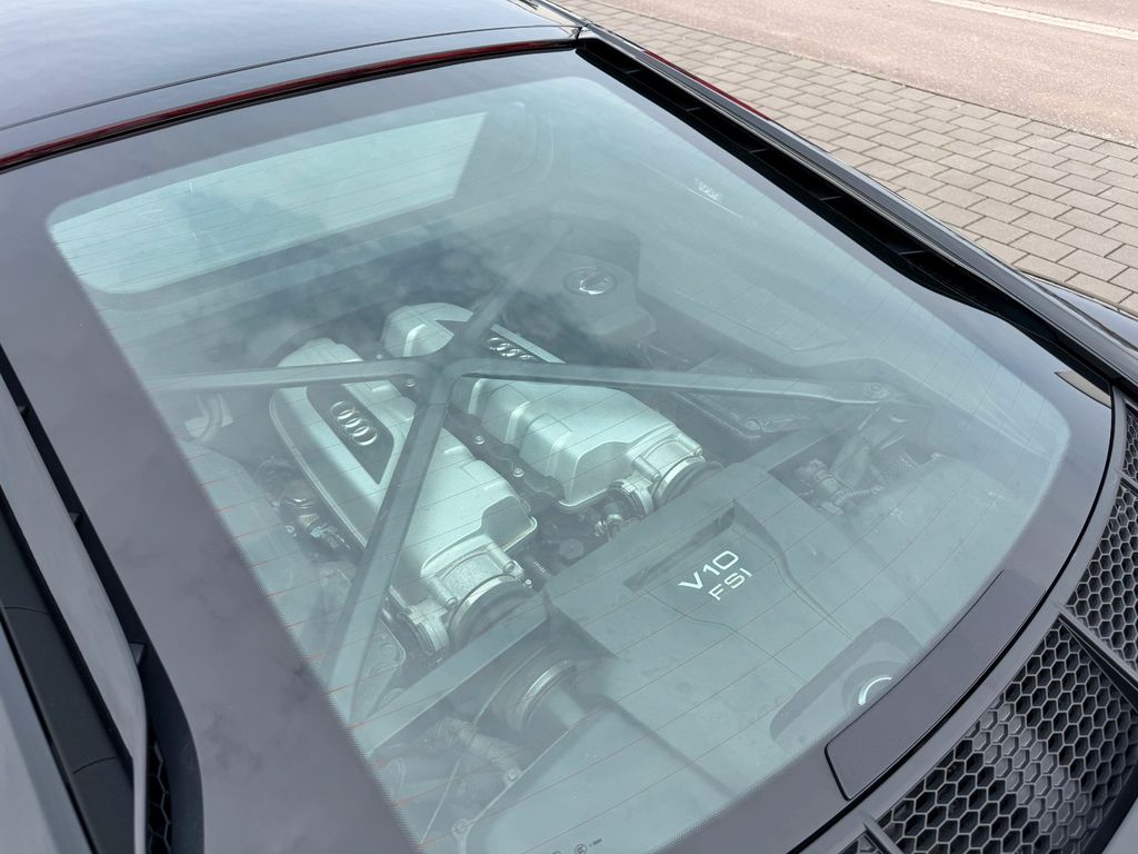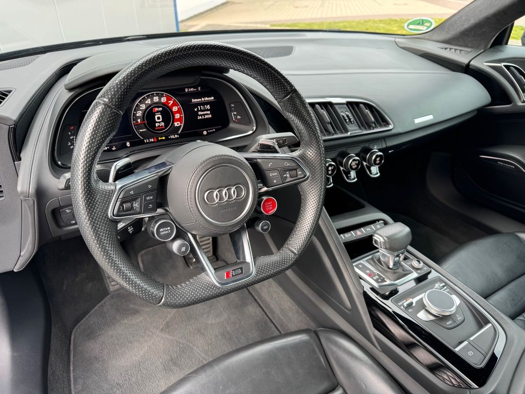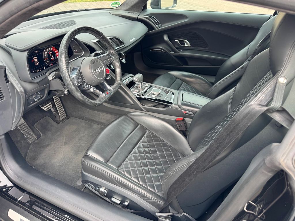 Airbag Beifahrerseite abschaltbar, Airbag Fahrer-/Beifahrerseite, Antriebs-Schlupfregelung (ASR), Audi Drive Select, Audi music interface, AUX-IN-Anschluss, Außenspiegel elektr. verstell-, heiz- und anklappbar, mit Abblendautomatik, Außenspiegel Wagenfarbe, Blinkleuchten LED in Außenspiegel integriert, Bremsanlage mit Rekuperationssystem, Bremsassistent, Diebstahlsicherung für Räder (Felgenschlösser), Einstiegsleisten mit Aluminiumeinlage, Elektron. Differentialsperre (EDS), Fahrwerk mit Dämpferregelung (Magnetic Ride), Frontscheibe Verbundglas, Fußmatten Velours, Heckleuchten LED mit dynamischem Blinklicht, Heckspoiler (elektrisch ausfahrbar), Innenausstattung: Dekoreinlagen Titanlack, Anthrazit, erweitert, Innenausstattung: Leder Feinnappa, Innenspiegel mit Abblendautomatik, Isofix-Aufnahmen für Kindersitz an Beifahrersitz, Karosserie: 2-türig, Klimaautomatik, Kombiinstrument digital (virtual cockpit), Kopf-Airbag-System (Sideguard), Kraftstofftank: 83 Ltr., Lendenwirbelstützen vorn, elektr. verstellbar, Lendenwirbelstützen vorn, pneumatisch verstellbar, Lenkrad (Sport/Leder - 3-Speichen, unten abgeflacht) mit Multifunktion plus, Licht-Paket, Modellvariante COD (cylinder on demand), Motor 5,2 Ltr. - 397 kW V10 40V FSI, Multi-Media-Interface MMI Navigation Plus mit MMI Touch, Nebelschlussleuchte, Nichtraucher-Paket, R8 Sportsitze, Reifen-Reparaturkit, Reifendruck-Kontrollsystem, Schadstoffarm nach Abgasnorm Euro 6, Schalt-/Wählhebelgriff Aluminium, Seitenairbag vorn, Sitzbezug / Polsterung: Leder Feinnappa, Sitze vorn elektr. verstellbar (mit Memory), Sitzheizung vorn, Sound-System Bang & Olufsen, Sport-Fahrwerk, Start/Stop-Anlage, Universal-Schnittstelle Bluetooth, Wärmeschutzverglasung grün getönt, Innenspiegel automatisch abblendend, Sitzheizung vorn