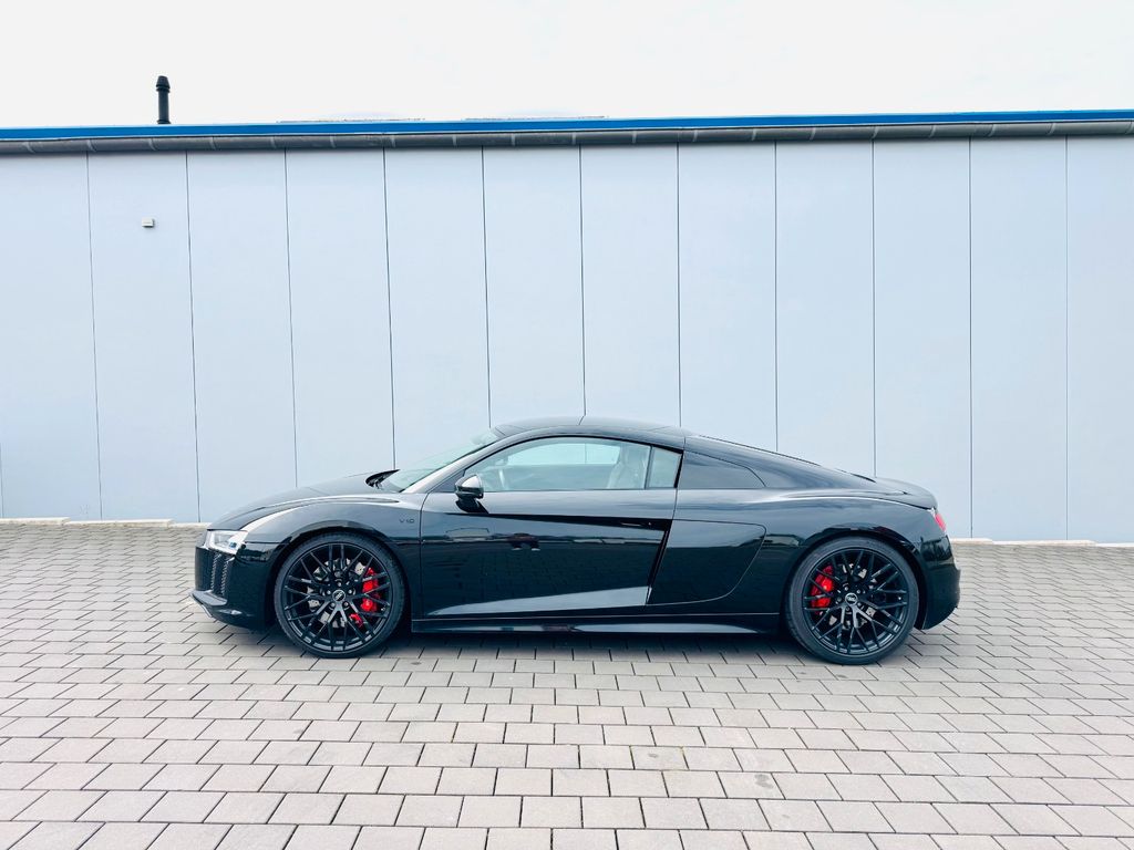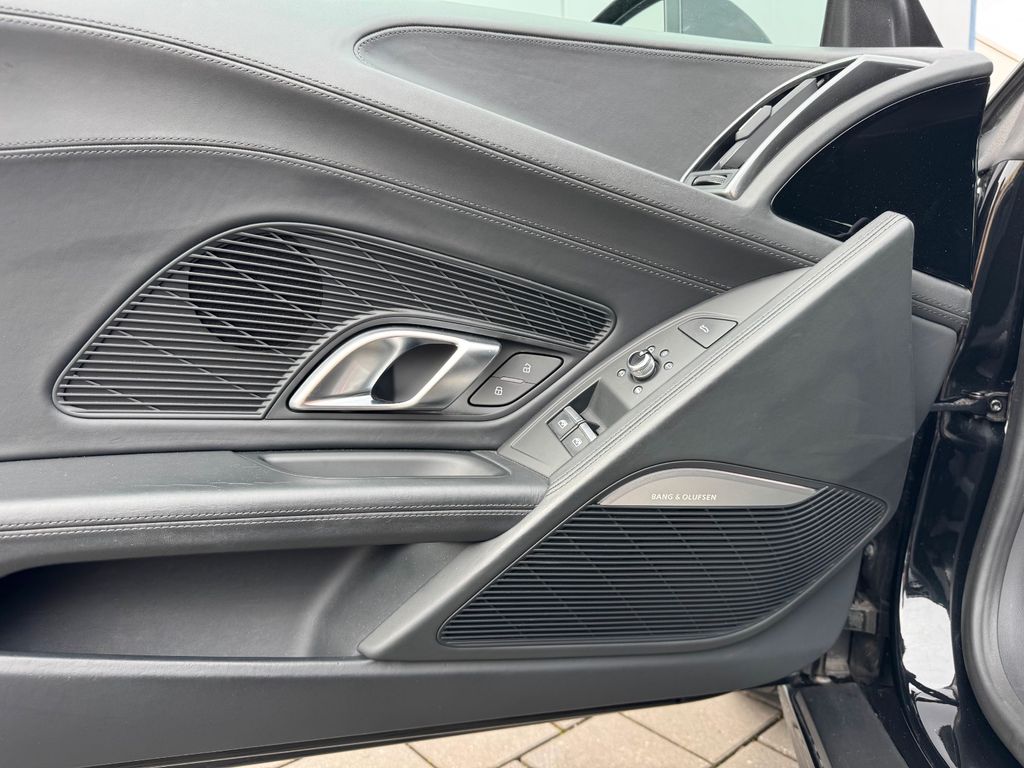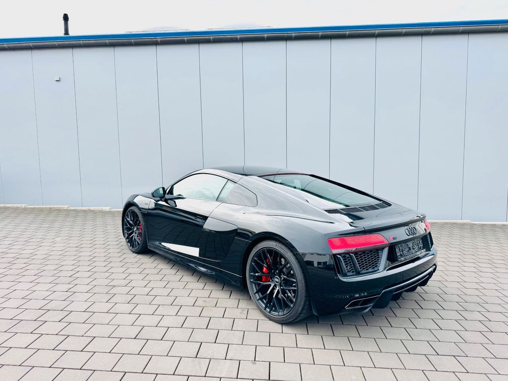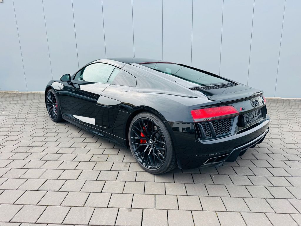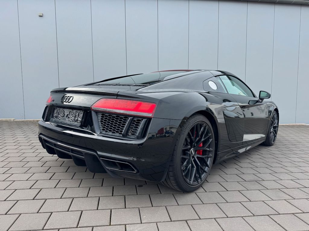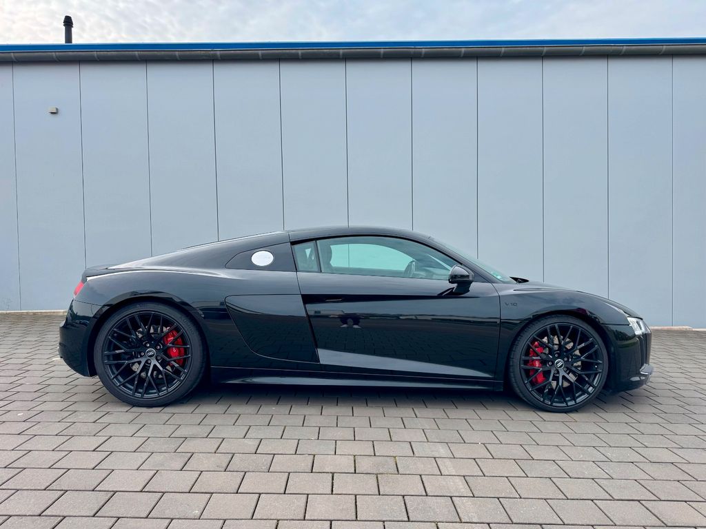 Airbag Beifahrerseite abschaltbar, Airbag Fahrer-/Beifahrerseite, Antriebs-Schlupfregelung (ASR), Audi Drive Select, Audi music interface, AUX-IN-Anschluss, Außenspiegel elektr. verstell-, heiz- und anklappbar, mit Abblendautomatik, Außenspiegel Wagenfarbe, Blinkleuchten LED in Außenspiegel integriert, Bremsanlage mit Rekuperationssystem, Bremsassistent, Diebstahlsicherung für Räder (Felgenschlösser), Einstiegsleisten mit Aluminiumeinlage, Elektron. Differentialsperre (EDS), Fahrwerk mit Dämpferregelung (Magnetic Ride), Frontscheibe Verbundglas, Fußmatten Velours, Heckleuchten LED mit dynamischem Blinklicht, Heckspoiler (elektrisch ausfahrbar), Innenausstattung: Dekoreinlagen Titanlack, Anthrazit, erweitert, Innenausstattung: Leder Feinnappa, Innenspiegel mit Abblendautomatik, Isofix-Aufnahmen für Kindersitz an Beifahrersitz, Karosserie: 2-türig, Klimaautomatik, Kombiinstrument digital (virtual cockpit), Kopf-Airbag-System (Sideguard), Kraftstofftank: 83 Ltr., Lendenwirbelstützen vorn, elektr. verstellbar, Lendenwirbelstützen vorn, pneumatisch verstellbar, Lenkrad (Sport/Leder - 3-Speichen, unten abgeflacht) mit Multifunktion plus, Licht-Paket, Modellvariante COD (cylinder on demand), Motor 5,2 Ltr. - 397 kW V10 40V FSI, Multi-Media-Interface MMI Navigation Plus mit MMI Touch, Nebelschlussleuchte, Nichtraucher-Paket, R8 Sportsitze, Reifen-Reparaturkit, Reifendruck-Kontrollsystem, Schadstoffarm nach Abgasnorm Euro 6, Schalt-/Wählhebelgriff Aluminium, Seitenairbag vorn, Sitzbezug / Polsterung: Leder Feinnappa, Sitze vorn elektr. verstellbar (mit Memory), Sitzheizung vorn, Sound-System Bang & Olufsen, Sport-Fahrwerk, Start/Stop-Anlage, Universal-Schnittstelle Bluetooth, Wärmeschutzverglasung grün getönt, Innenspiegel automatisch abblendend, Sitzheizung vorn