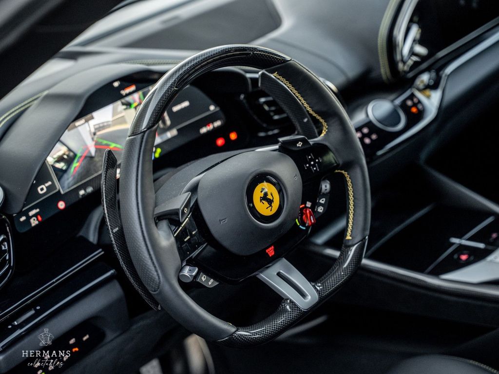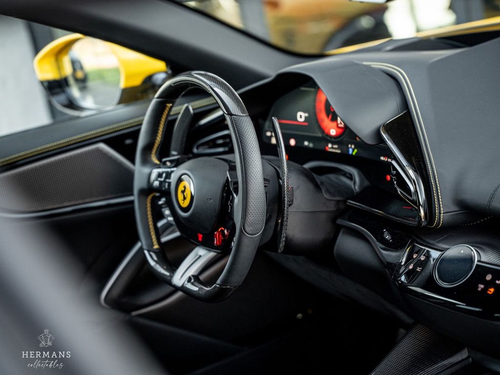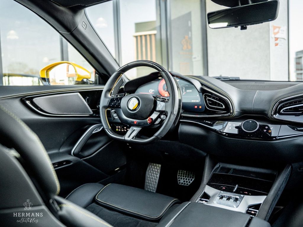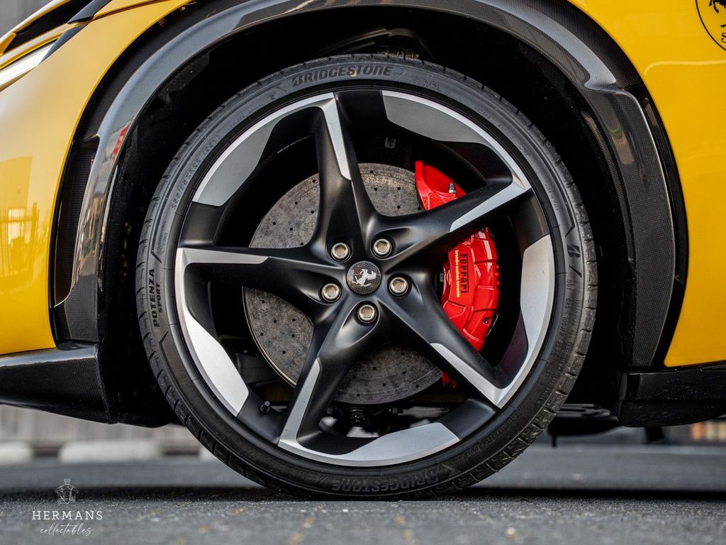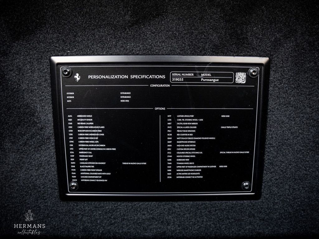 Der Ferrari ist mit folgenden (zusätzlichen) Optionen ausgestattet: PNTE - Spezielle 4-Schicht-Farben - Giallo Triplo Strato, INTC - Nero 8500, ALOG - Airbrush-Embleme, CALR - Rote Bremssättel, CEXC - Radlaufverbreiterungen aus Carbonfaser, CEXD - Carbon-Diffusor, CEXS - Carbon-Seitenschweller, ECRF - Panoramadach, EXAB - Schwarz keramikbeschichtete Endrohre, FCWS - Carbon-Frontspoiler, PRG1 - Privacy-Verglasung, TIWN - Radbolzen aus Titan, CIIP - Carbon-Streifeneinsätze im Armaturenbrett, CIPZ - Türverkleidungen aus Carbon, CISK - Einstiegsleiste aus Carbon, CITZ - Oberer Teil der Mittelkonsole aus Carbonfaser, EMPH - Gesticktes Pferd in NUOVO GIALLO 0700E auf den Kopfstützen, FLMA - Zusätzliche farbige Fußmatten mit Logo, LEDS - Carbon-Lenkrad mit LEDs, STC2 - Spezieller Faden NUOVO GIALLO 0700E. ULEZ – Oberer Teil des Fahrgastraums in Leder – NERO 8500, AQS2 – Luftqualitätssensor, ELEV – Fahrwerkshöherlegung, FLRW – Kofferraum-Kit, HWCO – MyFerrari Connect Hardware-Vorbereitung, PPAC – Personalisierungspaket, SMRT – Smartphone-Schnittstelle, SNDX – High-End-Audiosystem, STWH – Beheizbares Lenkrad, SURR – Surround View, WIRE – Kabelloses Smartphone-Ladegerät, XLED – Aktive Matrix-LED-Scheinwerfer AFS3