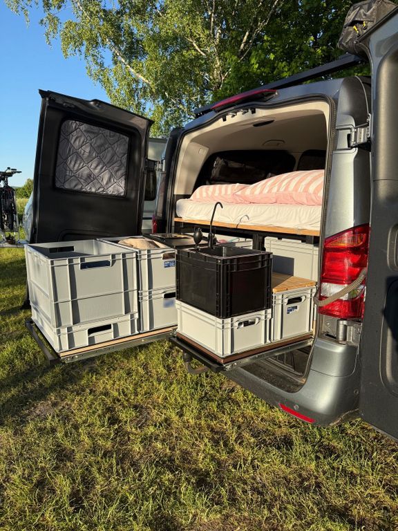 Der Heckausbau besteht aus stabilem 40x40 Aluprofil, einer zweiteiligen Matratze sowie Holzlattenrost. Durch zwei 200kg Schwerlastauszüge lassen sich alle wichtigen Urlaubsutensilien problemlos verstauen. Insgesamt lassen sich links 4x64l + 4x24l und rechts 4x27l + 4x17l verstauen.