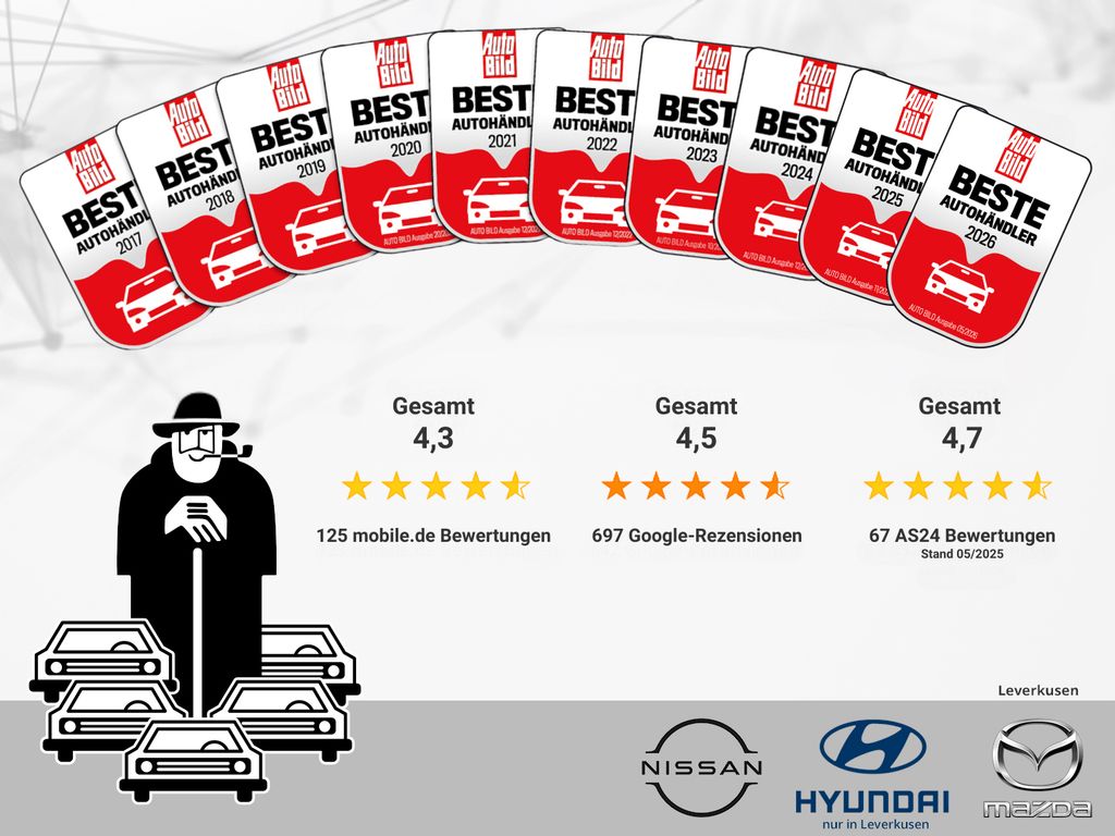 - Weiteres: E10 geeignet, Shark-Fin Dachantenne, DAB, Adaptive Geschwindigkeitsregelanlage (DRCC), 3-Speichen-Sport-Lederlenkrad inkl. Lenkradheizung, 6 Lautsprecher, Außenspiegel elektrisch einstellbar, anklappbar und beheizbar, integrierte LED-Seitenblinker, Advanced Driving Assistance System (ADAS), Multimediasystem mit kabellosem Apple CarPlay® und Android Auto™ mit 22,8 cm (9 Zoll) Touchdisplay, Dachhimmel in Schwarz, Berganfahrassistent (HLA), Qi: Induktives Laden (für kompatible Smartphones), Dynamische Stabilitätskontrolle (DSC), Digitale Geschwindigkeitsanzeige 17,8 cm (7 Zoll), Dachheckspoiler, eCall Notrufsystem, Einparkhilfe vorne und hinten mit Bremsunterstützung, Elektrische Fensterheber, vorne und hinten, Elektronische Parkbremse mit Auto-Hold-Funktion, EV-Fahrmodus, Fahrer- und Beifahrersitz höheneinstellbar, inkl. Lordosestütze, ISOFIX Kindersitzhalterung für die äußeren Sitze in der 2. Sitzreihe, Reifendruckwarnsystem (TPWS), Kühlergrill lackiert, Fahrmodus-Selektor (Standard / Eco / Sport), Spurhalteassistent (LTA), Spurwechselassistent (BSM), LED-Blinker, hinten, LED-Nebelscheinwerfer, Verkehrszeichenerkennung (TSR), Gepäckraumabdeckung, Wegfahrsperre, LED-Scheinwerfer mit Fernlichtassistent (AHB), Notbrems-Warnblinkautomatik (ESS), Haltegriffe, vorne und hinten, Heckscheibe und Seitenscheiben hinten abgedunkelt, Hybridsystemindikator, Regensensor, Innenspiegel automatisch abblendend, Rückfahrkamera, Smart-Key-System: Schlüsselloses Zugangssystem, Klimatisierungsautomatik, für Fahrer und Beifahrer getrennt regelbar, Lederschaltknauf, Traktionskontrollsystem (TCS), Lenkradbedientasten für Audioquelle und Lautstärke, Freisprecheinrichtung und Geschwindigkeitsregelanlage, Leselampe, vorne, Windschutzscheibe geräuschdämmend, Make-up Spiegel für Fahrer und Beifahrer, beleuchtet, Mittelarmlehne, vorne, Motor Start-/Stopp-Knopf, Rücksitzlehnen im Verhältnis 60:40 geteilt klappbar, Sitzheizung für Fahrer und Beifahrer, Sitzlehne für Fahrer- und Beifahrersitz neigungsverstellbar, Sitzfläche für den Fahrersitz neigungsverstellbar, Sportsitze in Schwarz mit Diamant-Muster (Sitzmittelbahn aus Stoff, Wangen aus Kunstleder), USB-Anschluss & Erweiterte Smartphone-Integration via Apple CarPlay & Android Auto®, Zentralverriegelung mit Funkfernbedienung, 17-Zoll-Leichtmetallfelgen mit 205/45 R17 Bereifung, Sitzbezüge aus Stoff und Kunstleder, Otto-Partikelfilter (OPF), Lichtsensor, Volldigitales Kombiinstrument, Digitalradio-Tuner (DAB), Start-Stopp-Automatik, Müdigkeitserkennung, Bordcomputer, Ambientebeleuchtung, Alarmanlage, Notbremsassistent (SBS), Freisprecheinrichtung mit Sprachsteuerung und Bluetooth®