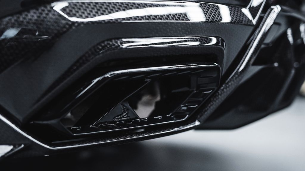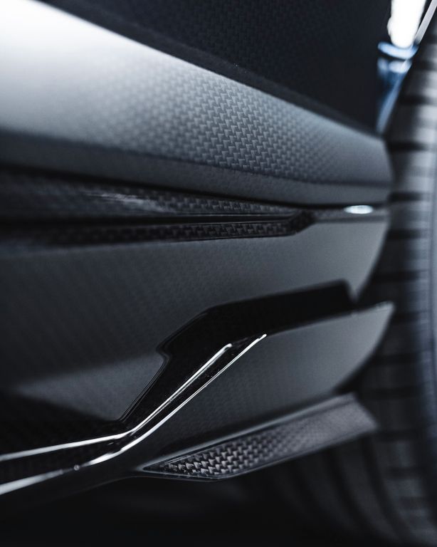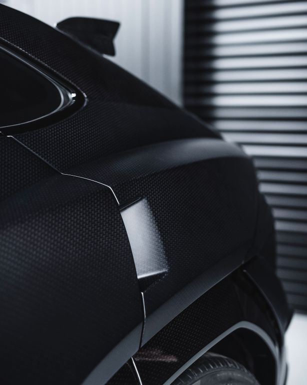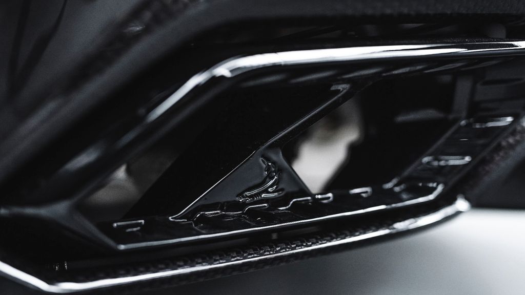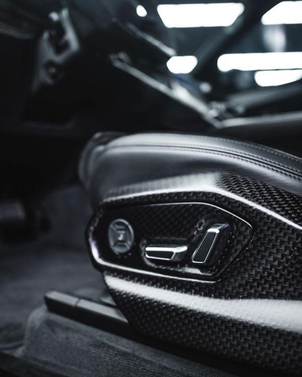 The conversion includes numerous visible carbon fibre components, among them the front bumper sections, bonnet, front fenders, side splitters, fender extensions, side skirts, front and rear doors, rear fenders, roof elements, roof spoiler, rear bumper sections, diffuser, exhaust tips, mirror caps, engine cover, door sill trims and a dedicated interior carbon package.