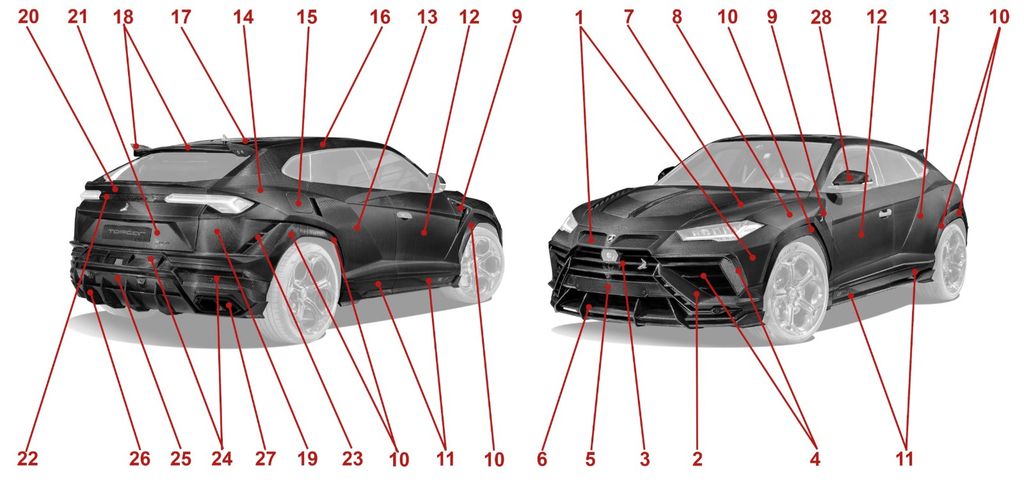This vehicle is equipped with the exclusive TopCar R’Evo Stealth Edition widebody conversion. According to TopCar, the project consists of over 130 individual carbon fibre components and transforms the Urus into a completely reworked full-carbon body concept with factory-style execution. The body is widened by 80 mm at the front and 88 mm at the rear, giving the car a much more aggressive and planted stance.