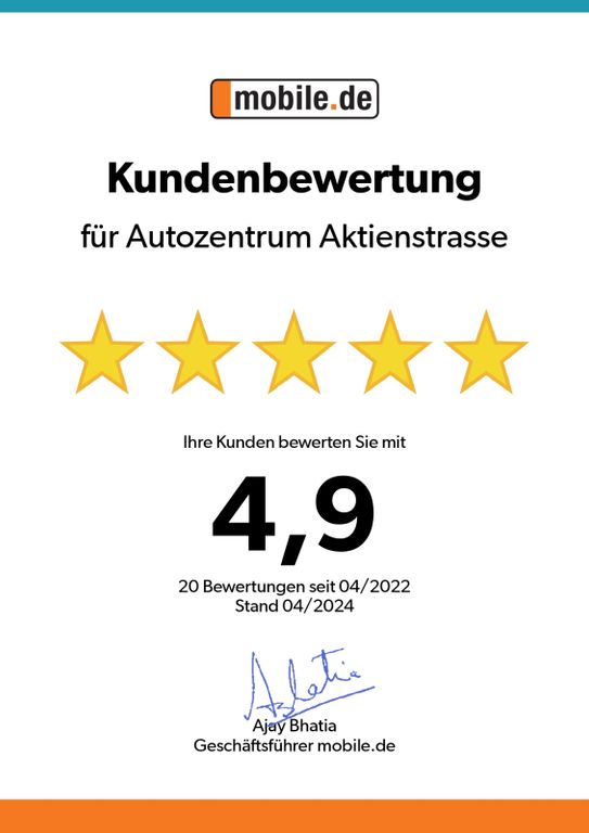 Euro 6 grüne Umweltplakette BESICHTIGUNG UND PROBEFAHRT MÖGLICH INZAHLUNGNAHME ZU FAIREN PREISEN INDIVIDUELLE FINANZIERUNG MÖGLICH TROTZ SORGFÄLTIGER PRÜFUNG SIND FEHLER NICHT AUSGESCHLOSSEN, DAHER DIENT DIE BESCHREIBUNG LEDIGLICH DER ALLGEMEIN IDENTIFIZIERUNG DES FAHRZEUGS UND STELLT KEINE GEWÄHRLEISTUNG IM KAUFRECHTLICHEN SINNE DAR GEBRAUCHWAGENGARANTIE bis 24 Monate SOWIE SERVICEPAKETE Gegen AUFPREIS MÖGLICH 12 Mo. Garanie 400.-Euro NETTO EXPORT INS EU-AUSLAND ODER DRITTLAND MÖGLICH ERLEDIGUNG ALLER ZOLLFORMALITÄTEN ÖFFNUNGSZEITEN: MO-FR: 09:30-18:00 SA: 09:30-14:00 www. autozentrum-aktienstrasse.com Mail: autozentrum-aktienstrasse@arcor.de Verkäufer Michael Stein 0049(0)1715039233