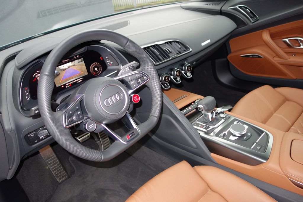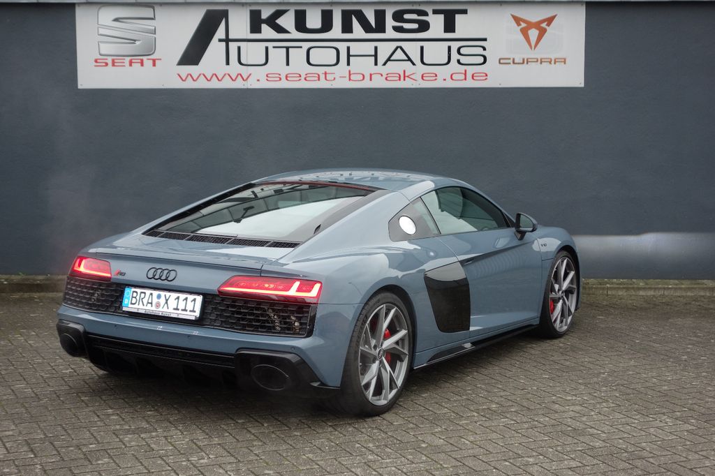 Airbag Beifahrerseite abschaltbar, Airbag Fahrer-/Beifahrerseite, Antriebs-Schlupfregelung (ASR), Antriebsart: Heckantrieb, Audi Drive Select, Außenspiegel Wagenfarbe, Blinkleuchten LED in Außenspiegel integriert, Bremsanlage mit Rekuperationssystem, Bremsassistent, Connectivity-Paket, Dachhimmel Stoff, Diebstahlsicherung für Räder (Felgenschlösser), Einstiegsleisten mit Aluminiumeinlage, Elektron. Differentialsperre (EDS), Fahrassistenz-System: Berganfahr-Assistent, Fahrassistenz-System: Fahrprofilauswahl (Performance Modus), Fahrassistenz-System: Müdigkeitserkennung (Pausenempfehlung), Frontscheibe Verbundglas, Fußmatten Velours, Gepäckraumbeleuchtung LED, Heckspoiler (elektrisch ausfahrbar), Innenausstattung: Dekoreinlagen Titanlack, Anthrazit, erweitert, Innenspiegel mit Abblendautomatik, Karosserie: 2-türig, Klimaautomatik, Kombiinstrument digital (virtual cockpit), Kopf-Airbag-System (Sideguard), Kühlergrill schwarz glänzend, Lendenwirbelstützen vorn, pneumatisch verstellbar, Leseleuchten vorn LED, Licht-Paket, Modellvariante COD (cylinder on demand), Motor 5,2 Ltr. - 397 kW V10 40V FSI, Multi-Media-Interface MMI Basic Plus / MMI Radio Plus, Nebelschlussleuchte, Otto-Partikelfilter (OPF), Radioempfang digital (DAB), Reifen-Reparaturkit, Reifendruck-Kontrollsystem, Schadstoffarm nach Abgasnorm Euro 6d, Schalt-/Wählhebelgriff Aluminium, Seitenairbag vorn, Sport-Fahrwerk, Start/Stop-Anlage, Wärmeschutzverglasung grün getönt