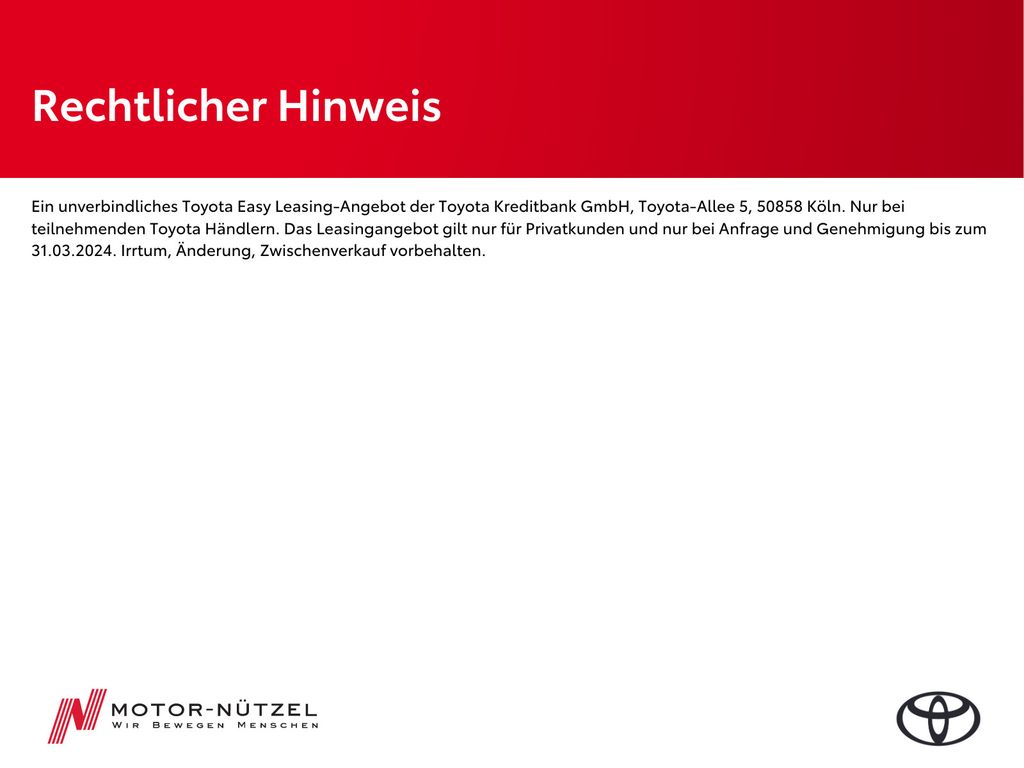 Angaben zum Hersteller: Toyota Deutschland GmbH, Toyota, Toyota-Allee 2, 50858 Köln, 02234-102-2690, kundenbetreuung(at)toyota.de