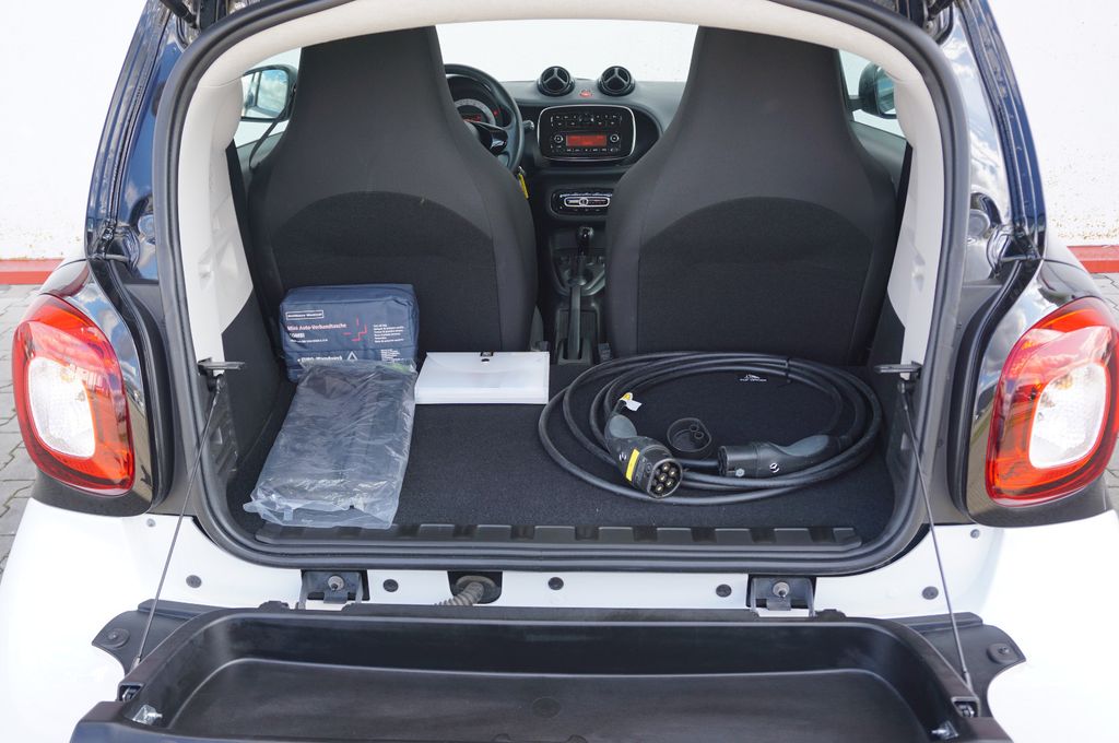 Airbag Beifahrerseite abschaltbar, Airbag Fahrer-/Beifahrerseite, Akustischer Fußgängerschutz (Soundmodul), Außenspiegel schwarz, Außentemperaturanzeige, Blinkleuchten seitlich Weiß, Bordcomputer, Cool & Audio-Paket, Design- und Ausstattungslinie Standard, Elektromotor 60 kW (cont. 41 kW), Fahrassistenz-System: aktiver Bremsassistent, Fahrassistenz-System: Berganfahr-Assistent, Fahrzeug mit HV-Kauf-Batterie, Fensterheber elektr. vorn, mit Einklemmschutz, Heckscheibenwischer, Isofix-Aufnahmen für Kindersitz, Karosserie: 3-türig, Knieairbag Fahrerseite, Kombiinstrument mit Monochrom-Display, Kopf-Airbag-System / Seitenairbag, Kühlermaske schwarz, genarbt, Ladekabel für öffentliche Ladesäulen, Lenkrad (Sport/Leder, 3-Speichen), Modellbezeichnung geändert, Modellpflege, Radioempfang digital (DAB), Reifendruck-Kontrollsystem, Schalt-/Wählhebelgriff Leder, Seitenairbag, Sitzbezug / Polsterung: Stoff, Sitzlehne vorn rechts umklappbar, Steckdose (12V-Anschluß), Tridion-Sicherheitszelle schwarz (Farbcode), Verzurrösen Koffer-/Laderaum, Volldach, Zusatzinstrumente für Batterieladezustand und Leistungsanzeige