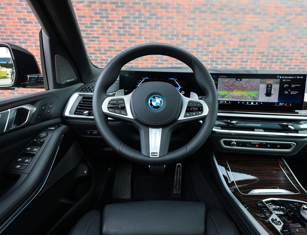 Inside, the sense of luxury continues effortlessly. The interior is fully finished in black Merino leather, combined with dark fine wood trim elements that create a warm and sophisticated atmosphere. The ventilated, heated, and massaging comfort seats ensure every journey is exceptionally pleasant, while the heated M leather steering wheel delivers the unmistakable, sporty BMW driving feel. On sunny days, the panoramic glass roof opens up to elevate the driving experience, perfectly paired with your favourite music through the Harman Kardon surround sound system.