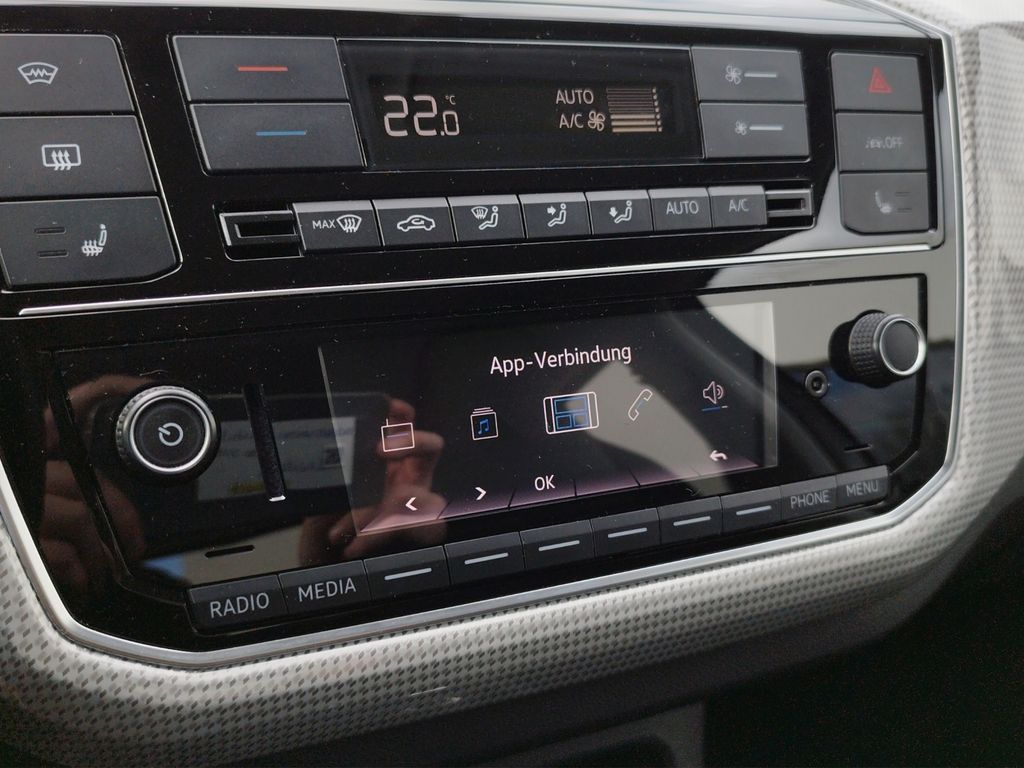 Klimaanlage "Climatronic" mit Aktiv-Kombifilter; Gepäckraumboden in 2 Höhen einstellbar und herausnehmbar; Gepäckraumabdeckung und Gepäcknetz; Multifunktionslenkrad in Leder; Multifunktionsanzeige; Fensterheber vorn elektrisch; Dachhimmel in light grey; Schalthebelknauf in Leder; Raucherausführung - Zigarettenanzünder und herausnehmbarer Aschenbecher vorn; dash pad "shark skin"; Einstiegsleisten vorn in Aluminium, mit Schriftzug "e-up!"; Taschenhalter; Einfassung der Ausströmer links / rechts sowie der Bedienelemente für Radio und Klimatisierung in Chrom