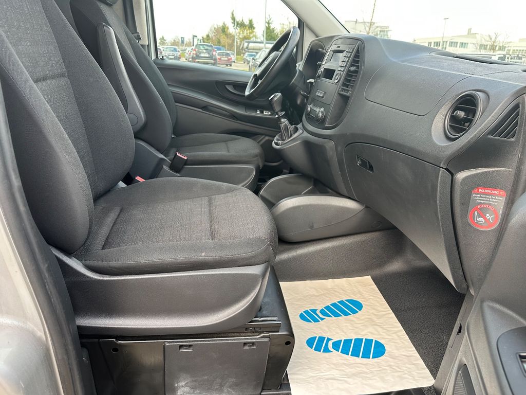 Weitere Ausstattung (Serienmäßig / Modellabhängig) Kategorie Ausstattung Sicherheitssysteme - Fahrer- & Beifahrerairbag- Gurtstraffer- Sicherheitsgurt-Warnanlage (vorn)- Adaptives Bremslicht- Bremsassistent- ABS + ASR- Attention Assist (Müdigkeitserkennung)- Seitenwind-Assistent- 3. Bremsleuchte- Nebelschlussleuchte Fahrassistenz & Komfort - Berganfahrhilfe (Anfahrassistent)- Außentemperaturanzeige- Rückspiegel innen Karosserie / Aufbau - Kastenwagen „Standard“- Langversion- Radstand: 3.200 mm Motorisierung / Umwelt - 2,1-Liter Diesel (100 kW) mit Katalysator- Euro 6 Abgasnorm- Kraftstofftank: 57 Liter Laderaum / Transport - Verzurrösen/Lastenverankerung- Verzurrschienen Seitenwand an Dachrahmen- Hartfaserverkleidung halbhoch- Deckenleuchte im Laderaum Verglasung & Antenne - Frontscheibe mit integrierter Antenne Türen / Zugang - Schiebetür rechts (Lade-/Fahrgastraum) Innenraum / Komfort - Haltegriff Beifahrerseite- Handschuhfach abschließbar- Getränkehalter vorn & hinten- Verkleidung der Fenstersäulen Räder / Fahrwerk - Stahlfelgen 6,5x16 Stromversorgung - Generator 150 A Service & Wartung - Wartungsintervall-Anzeige "ASSYST" Sitze & Polsterung - Sitzbezüge in Stoff Dach & Zubehör - Befestigungsschienen für Dachträger