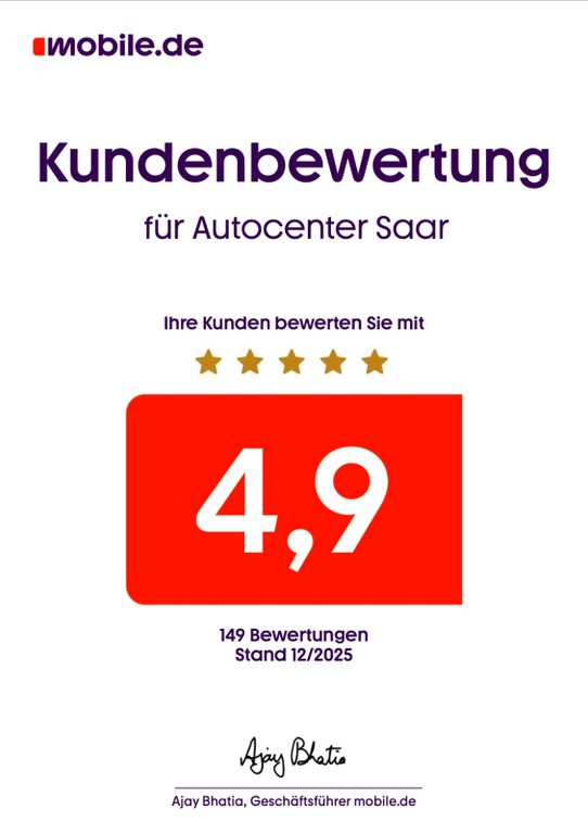 Die Fahrzeugbeschreibung dient lediglich der allgemeinen Identifizierung des Fahrzeugs und stellt keine Gewährleistung oder Zusicherung im kaufrechtlichen Sinne dar. Die Angaben erheben nicht den Anspruch auf Richtigkeit und Vollständigkeit. Irrtümer und Zwischenverkauf vorbehalten. Die gemachten Angaben, Beschreibung und Bilder sind unverbindlich und dienen nicht als zugesicherte Eigenschaften. Der Verkäufer übernimmt weder Haftung noch Gewährleistung für Tipp- und Datenübermittlungsfehler. Ausstattungen sowie Extras sind gegebenenfalls gesondert zu überprüfen.