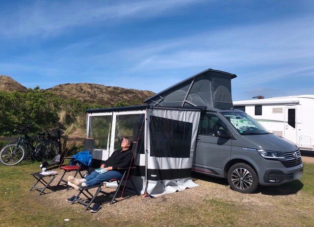 Die Campingstühle befinden sich in der Heckklappe, der zusätzliche Tisch für draußen befindet sich innen in der Schiebetür.