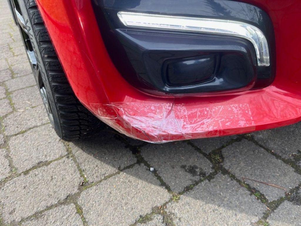 Die Stoßstange ist vorne rechts unten leicht gerissen, haben wir so vom Vorbesitzer übernommen, uns hat es nicht gestört, habe es mit Klebeband fixiert ( siehe Bild ).