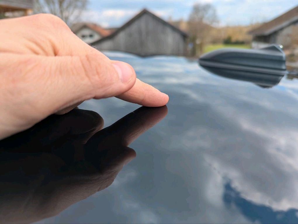 Der Wagen ist ein reines Nichtraucherfahrzeug und wurde extrem pfleglich behandelt. Er hat leider 56 minimale Hageldellen davongetragen, die jedoch so klein sind, dass sie nur bei speziellem Lichteinfall auffallen. Der Lack ist unbeschädigt. Da uns diese optische Kleinigkeit im Alltag nie gestört hat, haben wir sie belassen dies ist im fairen Preis bereits berücksichtigt.