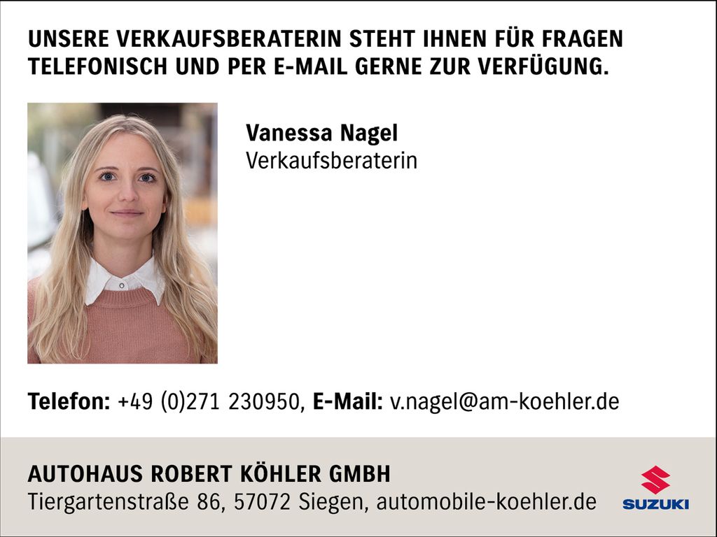 - Weiteres: Flame Orange, Müdigkeitserkennung, Klimaautomatik, Adaptiver Tempomat, Lichtsensor, Spurhaltesystem+Lenkeingriff, Ausparkassistent, Audio-System+Smartphone Link, 16 Alufelgen, Toter Winkel-Warnsystem, Guide me Light-Funktion, DAB Radio, Dual Sensor Break Support, Aussenspiegel elektr.verstellbar, Aussenspiegel elektr.anklappbar, Fahrersitz höhenverstellbar, Fernlichtassistent, Beheizbare Aussenspiegel, Aussenspiegel inkl.Seitenblinker, ISOFIX, Keyless Start, LED-Tagfahrlicht, LED Scheinwerfer, Lichtsensor, Lederlenkrad, Navigationssystem, Einparkhilfe hinten, Abgedunkelte Scheiben hinten, Elektr.Fensterheber vo/hi, Rückfahrkamera, Suzuki Connect, Sitzheizung, SHVS Mild Hybrid System, Reifendruckkontrollanzeige, Verkehrszeichenerkennung, USB Anschluss, Front-/Seiten-/Vorhangairbags, 6 Lautsprecher