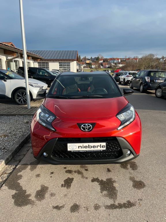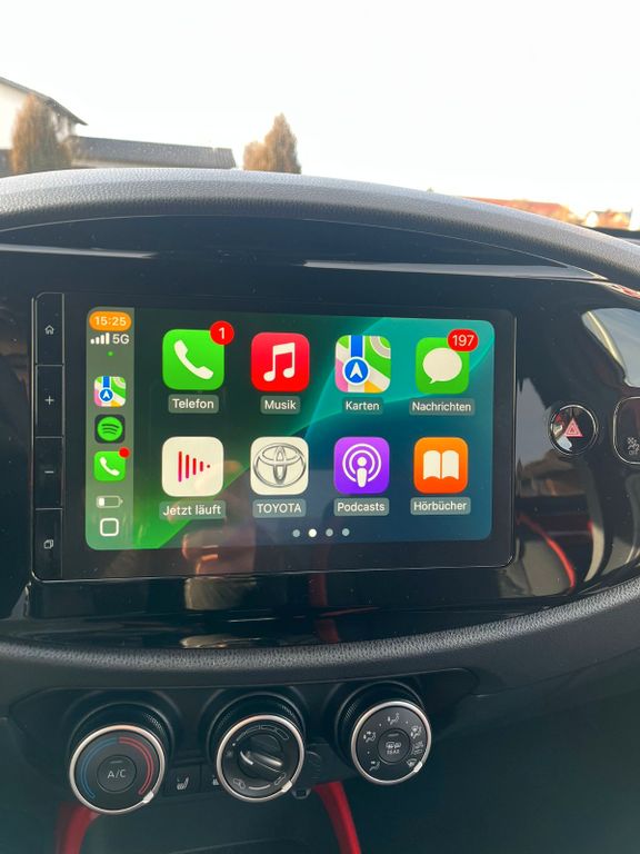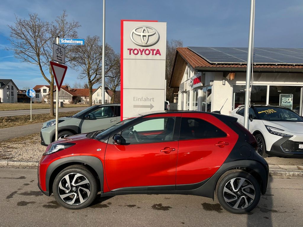 2-Farben-Lackierung Metallic, 3. Bremsleuchte, Airbag Fahrer-/Beifahrerseite, Audiobedienung am Lenkrad, Audiosystem: Multimedia Toyota Touch, Autom. Begleitfunktion der Beleuchtung (Follow me home, FMH), Außenspiegel elektr. verstell- und heizbar, Außenspiegel schwarz lackiert, Design-Paket, Fahrassistenz-System: Eco-Anzeige für verbrauchsoptimiertes Fahren, Fahrassistenz-System: Fernlichtassistent (Abblendautomatik Fahrlicht, AHB), Fahrassistenz-System: Sicherheitssystem Toyota Connect mit automatischem Notruf (eCall), Gepäckraumabdeckung / Rollo, Innenraumfilter: Staub- und Pollenfilter mit Aktivkohlefilter, Isofix-Kindersitz-System, Karosserie: 5-türig, Kindersicherung, Kopf-Airbag-System, Kopfstützen hinten, Lenkrad Applikationen in Pianoschwarz, Lenksäule (Lenkrad) höhenverstellbar, LM-Felgen, Motor 1,0 Ltr. - 53 kW KAT, Multimedia Display (9,0 Zoll), Park-Assistent mit Rückfahrkamera, Reifen-Reparaturkit, Reifendruck-Kontrollsystem, Rücksitz klappbar, Schadstoffarm nach Abgasnorm Euro 6e, Schutzfolie Türgriffmulde, Seitenairbag vorn, Sitz vorn links höhenverstellbar, Sitzheizung vorn, Sonnenblenden mit Make-up-Spiegel, Stop&Go-System (TSGS), Stoßfänger Wagenfarbe, Toyota Safety Sense, Türgriffe außen Wagenfarbe, Türgriffe innen verchromt, Warnanlage für Sicherheitsgurte hinten, Warnanlage für Sicherheitsgurte vorn