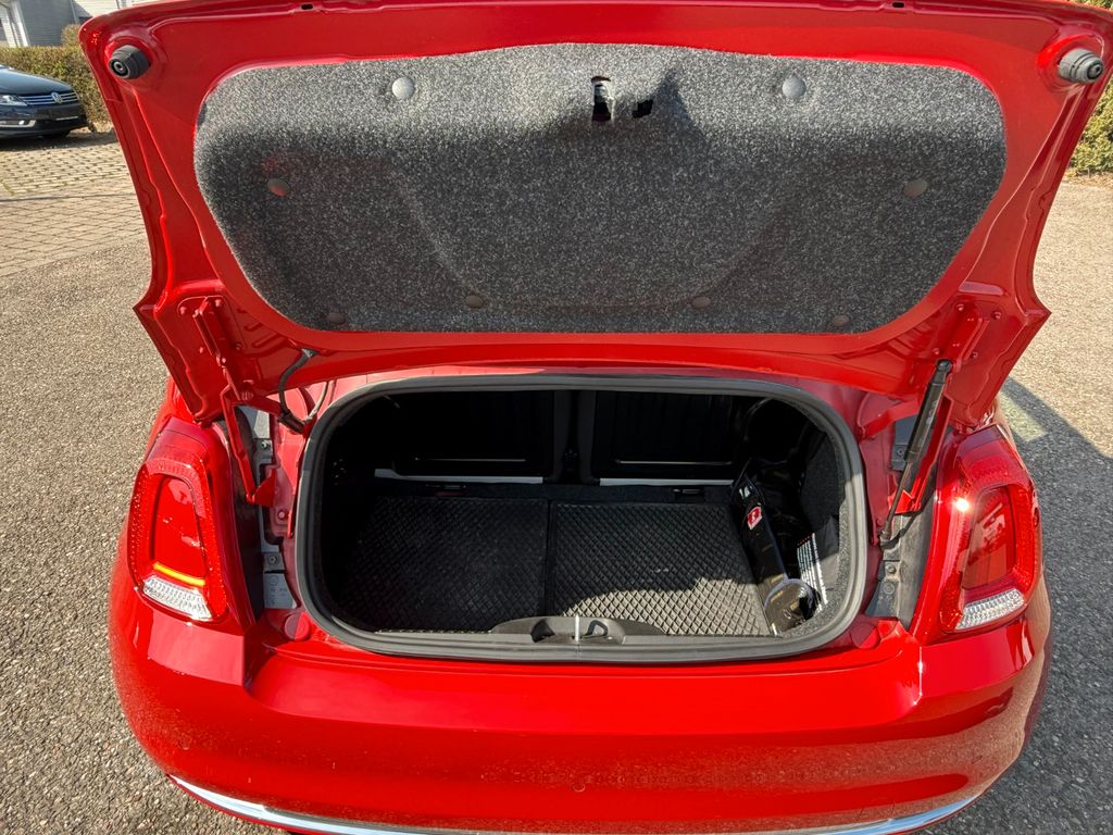 Ablagetasche an Vordersitzlehnen, Airbag Fahrer-/Beifahrerseite, Auspuffblende verchromt, Autom. Begleitfunktion der Beleuchtung (Follow me home), Automatische Türverriegelung, Außenspiegel elektr. verstellbar, beide, Außenspiegel verchromt, Beifahrerairbag abschaltbar, Bordcomputer, Einstiegsleisten (verchromt), Elektr. Bremskraftverteilung, Fahrassistenz-System: Bremsassistent, Faltdach elektrisch, Fensterzierleisten verchromt, Fußmatten, Geschwindigkeits-Begrenzeranlage, Gurtstraffer vorn, Heckscheibe heizbar, Heckspoiler, Innenausstattung: Dekoreinlagen Armaturenbrett, lackiert, Isofix-Aufnahmen für Kindersitz an Rücksitz, Karosserie: 2-türig, Knieairbag Fahrerseite, Komfort-Paket, Kopf-Airbag-System vorn, Kopf-Airbag-System vorn und hinten, Kopfstützen vorn verstellbar, Kühlergrill verchromt, Lenksäule (Lenkrad) höhenverstellbar, LM-Felgen, Mild-Hybrid 51 kW (Motor 1,0 Ltr. - 51 kW), Modellpflege, Radioempfang digital (DAB+), Reifen-Reparaturkit, Reifendruck-Kontrollsystem, Rücksitz geteilt / klappbar, Schadstoffarm nach Abgasnorm Euro 6d, Schalt-/Wählhebelgriff Leder, Seitenairbag vorn, Seitenschutzleisten lackiert inkl. Emblem 500, Sitzbezug / Polsterung: Stoff / Vinyl, Smartphone Schnittstelle (Apple CarPlay & Android Auto), Start/Stop-Anlage, Steckdose (12V-Anschluß) im Armaturenbrett, Steckdose (12V-Anschluß) vorn, Stoßfänger Wagenfarbe, Tagfahrlicht LED, Türgriffe außen verchromt, Wärmeschutzverglasung
