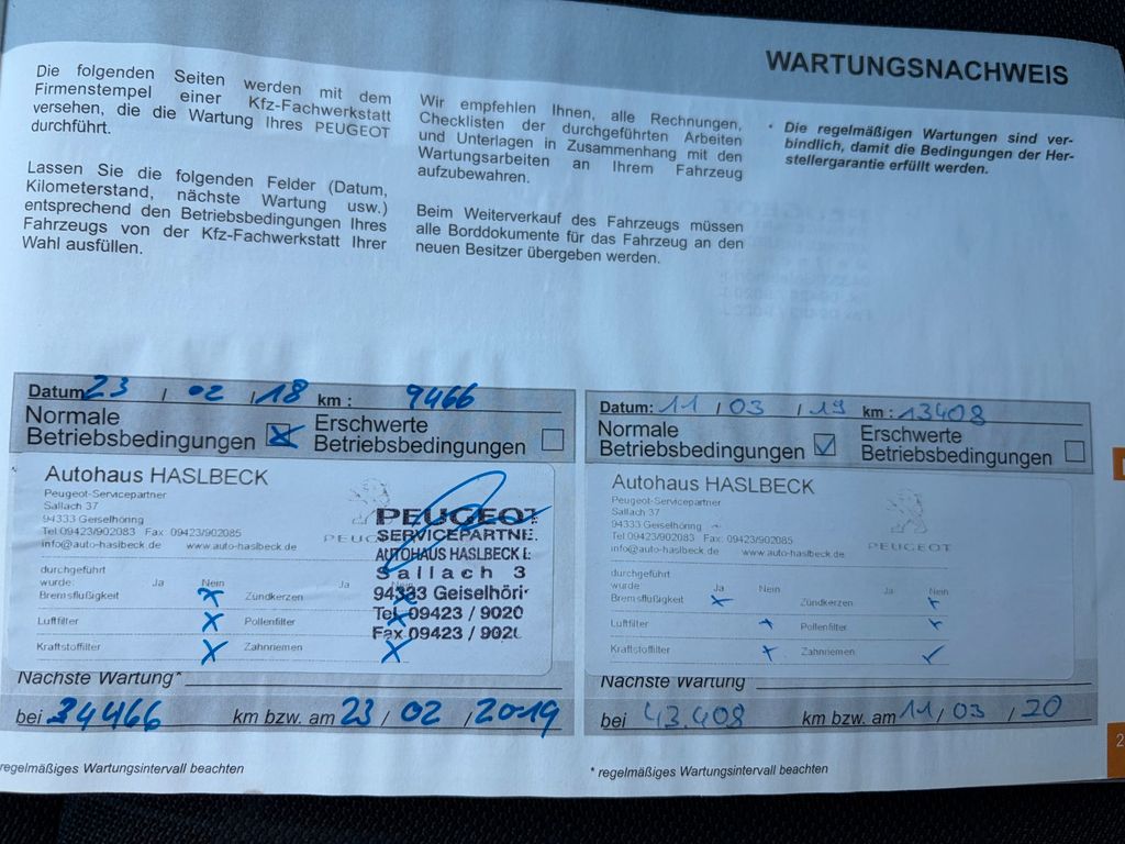 1. Service bei 9.466 Kilometerstand am 23.02.2018 bei Peugeot