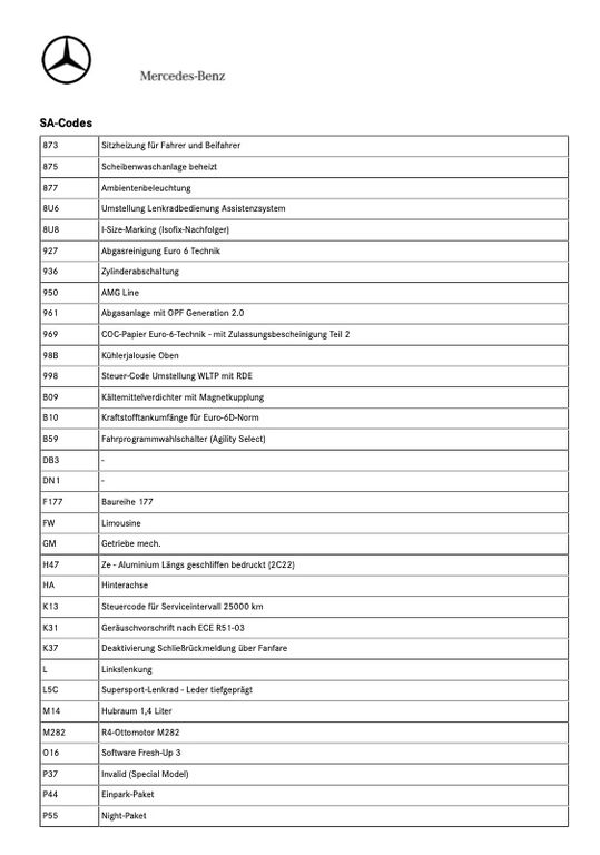 Airbag Beifahrerseite abschaltbar, Airbag Fahrer-/Beifahrerseite, Außenspiegel elektr. verstell- und heizbar, beide, Beckenairbag vorn (Pelvisbag), DAB-Tuner (Radioempfang digital), Design- und Ausstattungslinie AMG Line, Edelstahlpedale Sportdesign, Fahrassistenz-System: Agility Select / Dynamic Select (Fahrmodusschalter), Fahrassistenz-System: aktiver Bremsassistent, Fahrassistenz-System: aktiver Spurhalteassistent, Fahrzeug Setup (Onlinedienste / Apps), Fahrzeug-Monitoring (Fahrzeugortungssystem), Fensterheber elektrisch vorn + hinten, Getränkehalter vorn (doppelt), Innenausstattung: Zierteile Aluminium Längsschliff, Innenhimmel schwarz, Karosserie: 5-türig, Keyless Go Startanlage, Klimaautomatik (Thermatic), Knieairbag Fahrerseite, Komfort-Fahrwerk tiefergelegt (Agility Control), Kommunikationsmodul (LTE) Vorbereitung Mercedes me connect, Kopf-Airbag-System (Windowbag), Lenkrad (Sport) mit Multifunktion, Licht- und Sicht-Paket, LM-Felgen, Mercedes-Benz Notrufsystem, Motor 1,3 Ltr. - 100 kW KAT, Multimediasystem MBUX (Digitales Multimedia-System), Night-Paket, Reifendruck-Kontrollsystem, Schadstoffarm nach Abgasnorm Euro 6d, Seitenairbag (Sidebag) vorn, Seitenschweller Wagenfarbe, Sitzbezug / Polsterung: Ledernachbildung Artico / Dinamica, Sportsitze vorn, Sprachbediensystem Erweiterte Funktionen (MBUX), Start/Stop-Anlage, Styling-Paket (AMG / Exterieur), Touchpad (Mittelkonsole), USB-Anschluss im Fond, Ambiente-Beleuchtung, Regensensor