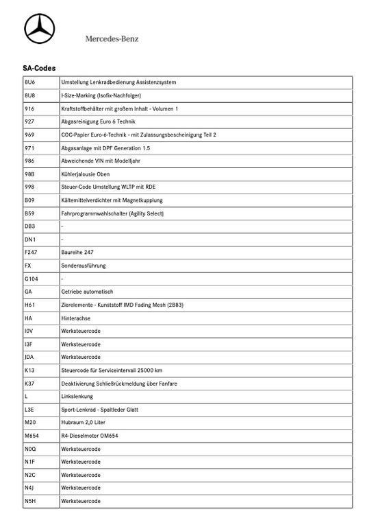 Airbag Beifahrerseite abschaltbar, Airbag Fahrer-/Beifahrerseite, Außenspiegel Wagenfarbe, Beckenairbag vorn (Pelvisbag), DAB-Tuner (Radioempfang digital), Design- und Ausstattungslinie Style, Easy-Entry Funktion, Einschaltautomatik für Fahrlicht, Fahrassistenz-System: Agility Select / Dynamic Select (Fahrmodusschalter), Fahrassistenz-System: aktiver Bremsassistent, Fahrassistenz-System: aktiver Spurhalteassistent, Fahrzeug Setup (Onlinedienste / Apps), Fahrzeug-Monitoring (Fahrzeugortungssystem), Fensterheber elektrisch vorn + hinten, Gepäckraumabdeckung / Rollo, Getriebe 8-Gang - Doppelkupplungsgetriebe DCT, Infotainment-System: Remote Service (Plus), Karosserie: 5-türig, Keyless Go Startanlage, Klimaautomatik (Thermatic), Knieairbag Fahrerseite, Komfort-Fahrwerk (Agility Control), Kommunikationsmodul (LTE) Vorbereitung Mercedes me connect, Kopf-Airbag-System (Windowbag), Kraftstofftank: vergrößert, Lenkrad (Sport) mit Multifunktion, Licht- und Sicht-Paket, Mercedes-Benz Notrufsystem, Mittelarmlehne hinten, Motor 2,0 Ltr. - 140 kW CDI KAT, Multimediasystem MBUX (Digitales Multimedia-System), Radstand 2829 mm, Reifendruck-Kontrollsystem, Rücksitzlehne geteilt / klappbar, Rücksitzlehne neigungsverstellbar, Schadstoffarm nach Abgasnorm Euro 6d, Seitenairbag (Sidebag) vorn, Sprachbediensystem Erweiterte Funktionen (MBUX), Start/Stop-Anlage, Touchpad (Mittelkonsole), USB-Anschluss im Fond, Regensensor