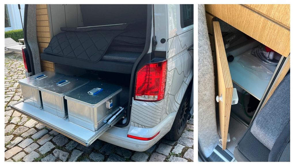 • Küche mit Induktionskochfeld (Caso Master E2), Edelstahlspüle, 45L Dometic-Kompressor-Kühlschrank, Stauraum & LED-Arbeitsbeleuchtung