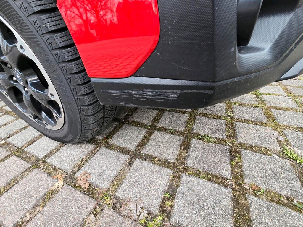 An der Vorderen Stoßstange vorne befindet sich eine winzige Macke, und im Dach eine kleine Delle. (vermutlich Kastanie drauf gefallen) Diese werden noch behoben. Die einzige Macke, die wohl bestehen bleiben muss, ist ein Kratzer rechts unten im unlackierten Bereich der vorderen Stoßstange. (Im Bild 2 etwas erkennbar)