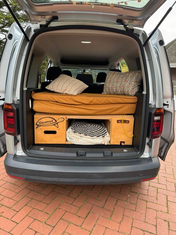 Wir verkaufen unseren gern gefahrenen und gepflegten Caddy, da wir uns vergrößern wollen und auf einen Bus umsteigen.Er kann mit wenigen Hangriffen zu einem Mini Camper umgebaut werden, oder ohne Bettkonstruktion im Alltag genutzt werden.