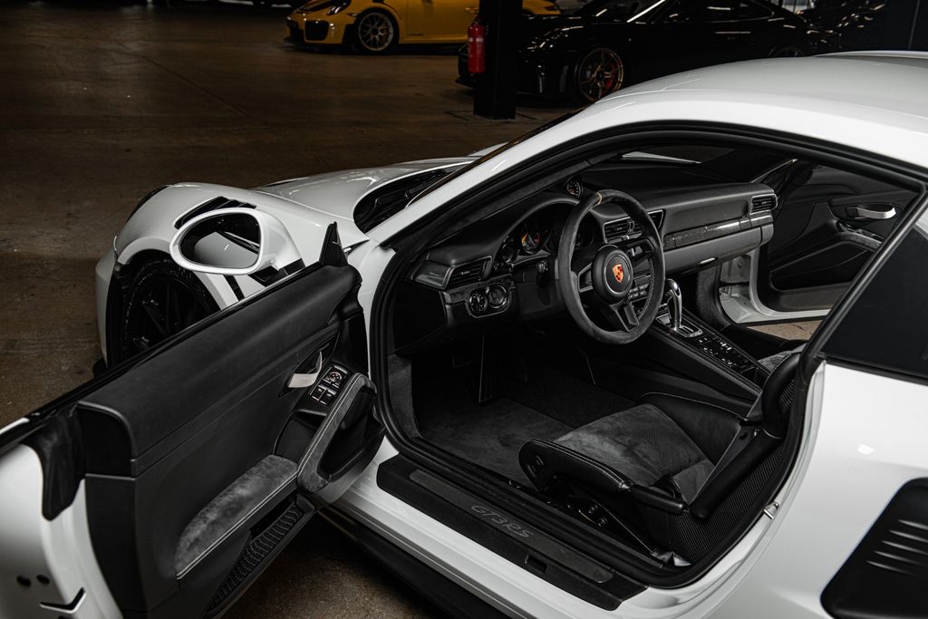 The seriousness of the moment descends upon the driver when you open the driver's door. The interior is as serious as the exterior with bucket seats and a half-cage. The driver's environment is recognizable if a little more focused with an Alcantara steering wheel and six-point belts for both driver and passenger. The five iconic analog meters focus on the most necessary information. Continuously maintained according to Porsche's own recommendations and with a mere 2931 miles indicated from new. Full PPF on the entire car and ceramic protection on top of this. Original rims and a number of other paraphernalia accompany the car upon purchase.