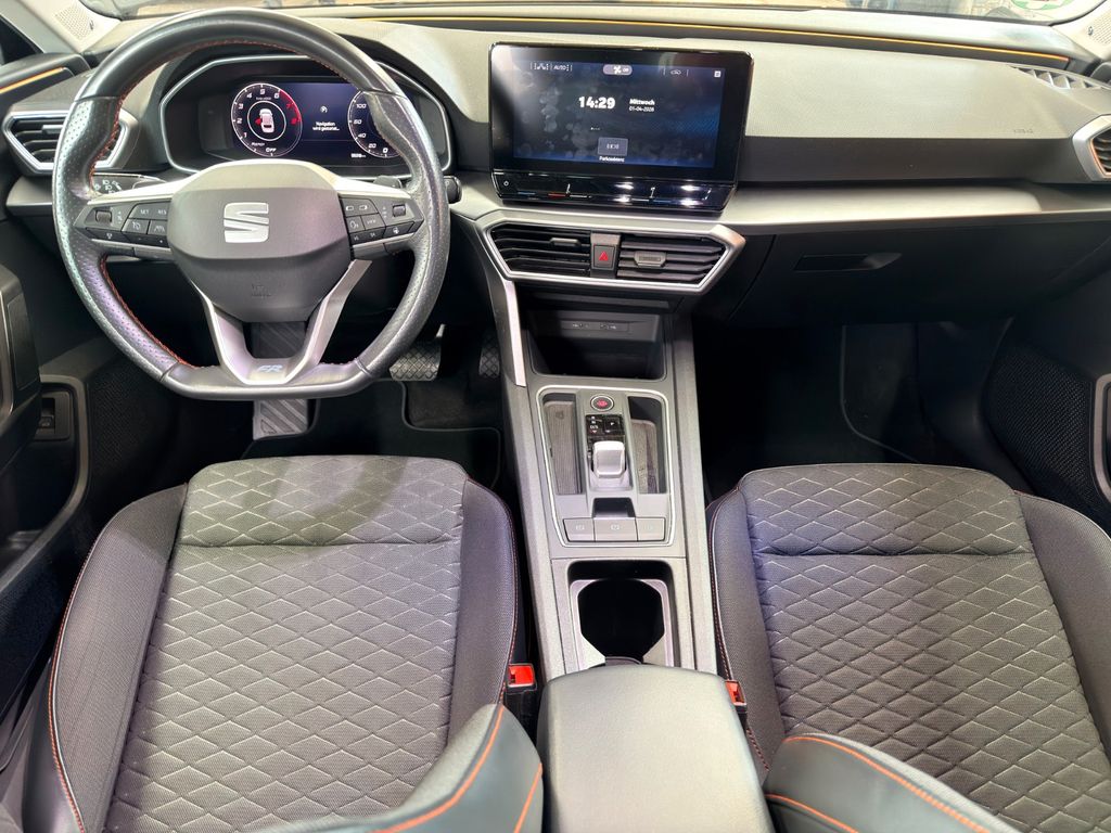 6 Lautsprecher, Ablagetasche an Vordersitzlehnen, Airbag Beifahrerseite abschaltbar, Airbag Fahrer-/Beifahrerseite, Antriebs-Schlupfregelung (ASR), Außenspiegel elektr. verstell-, heiz- und anklappbar mit Spiegelabsenkung, Außenspiegel grau, Blinkleuchten LED in Außenspiegel integriert, Bluetooth-Schnittstelle mit Freisprecheinrichtung integriert, Bordcomputer, Dachreling, Doppeltonhorn, Durchladeeinrichtung (Mittelarmlehne hinten), Einstiegsleisten beleuchtet, Elektron. Querdifferentialsperre (XDS), Fahrassistenz-System: Fahrprofilauswahl (SEAT Drive Profile), Fahrassistenz-System: Müdigkeitserkennung, Fahrassistenz-System: Spurhalteassistent, Fahrassistenz-System: Umfeldbeobachtungssystem (Front assist) mit City-Notbremsfunktion, Fensterheber elektrisch vorn + hinten mit Komfortschaltung, Gepäckraumabdeckung / Rollo, Handschuhfach beleuchtet, Heckleuchten Voll-LED mit dynamischem Lichtband (Infinite Light), Innenraumlicht-Paket LED, Isofix-Aufnahmen für Kindersitz, Karosserie: 5-türig, Klimaanlage Climatronic 3-Zonen, Kofferraumbeleuchtung, Kombiinstrument digital (virtual cockpit), Kopf-Airbag-System, Laderaumboden variabel und herausnehmbar, Lendenwirbelstütze Sitz vorn links, verstellbar, Lendenwirbelstütze Sitz vorn rechts, verstellbar, Lenkrad (Sport/Leder) mit Multifunktion, Mild-Hybrid 110 kW (Motor 1,5 Ltr. - 110 kW eTSI ACT), Mobile Online Dienste Seat Connect, Nebelscheinwerfer LED mit Abbiegelicht, Notrufsystem, Otto-Partikelfilter (OPF), Parkbremse elektrisch mit Auto-Hold-Funktion, Radioempfang digital (DAB+), Reifenkontroll-Anzeige, Rücksitzlehne geteilt/klappbar (1/3-2/3), Rücksitzlehnen umklappbar mit Fernentriegelung im Kofferraum, Schadstoffarm nach Abgasnorm Euro 6d, Schalt-/Wählhebelgriff Leder, Seitenairbag, Seitenairbag vorn mitte (Central Airbag), Seitenscheiben hinten und Heckscheibe abgedunkelt, Sitz vorn links höhenverstellbar, Sitz vorn rechts höhenverstellbar, Sitzbezug / Polsterung: Stoff, Sport-Fahrwerk, Sport-Komfortsitze vorn, Start/Stop-Anlage, Steckdose (12V-Anschluß) im Koffer-/Laderaum, Steckdose (12V-Anschluß) vorn, Stoßfänger FR-Design, USB-Schnittstelle vorn (2-fach, Typ C), Verzurrösen Koffer-/Laderaum, Warnanlage für Sicherheitsgurt-System, Wärmeschutzverglasung