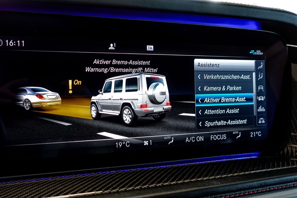 Ambiente-Beleuchtung (erweiterter Umfang), Exterieur-Paket Edelstahl, Fahrwerks-Dämpfungssystem mit Wahlstufen (Comfort + Sport), Feuerlöscher, G Manufaktur Interieur Plus, Gepäckraumabdeckung / Rollo, Gummimatten Laderaum, Innenausstattung: Zierteile Carbon (AMG), Ionisator zur Luftreinigung, Kombiinstrument mit Variabler Anzeige (Widescreen Cockpit), Lackierung: designo magno, Lastschutznetz, Lenkrad heizbar, LM-Felgen 8,5x20 (AMG, Vielspeichen, schwarz, glanzgedreht), Media Interface (Universal-Schnittstelle für iPod / AUX / USB / MP3), Mercedesstern vorn und hinten in Schwarz, Multibeam LED, Multikontursitz-Paket Aktiv, Night-Paket, Park-Paket mit 360° Kamera, Reserverad-Abdeckung Wagenfarbe, Schiebedach elektrisch, Seitenairbag (Sidebag) hinten, Sitzbezug / Polsterung: MANUFAKTUR Leder Nappa, 2-farbig mit A-Band, Surround-System Burmester, Unterfahrschutz (Chrom)