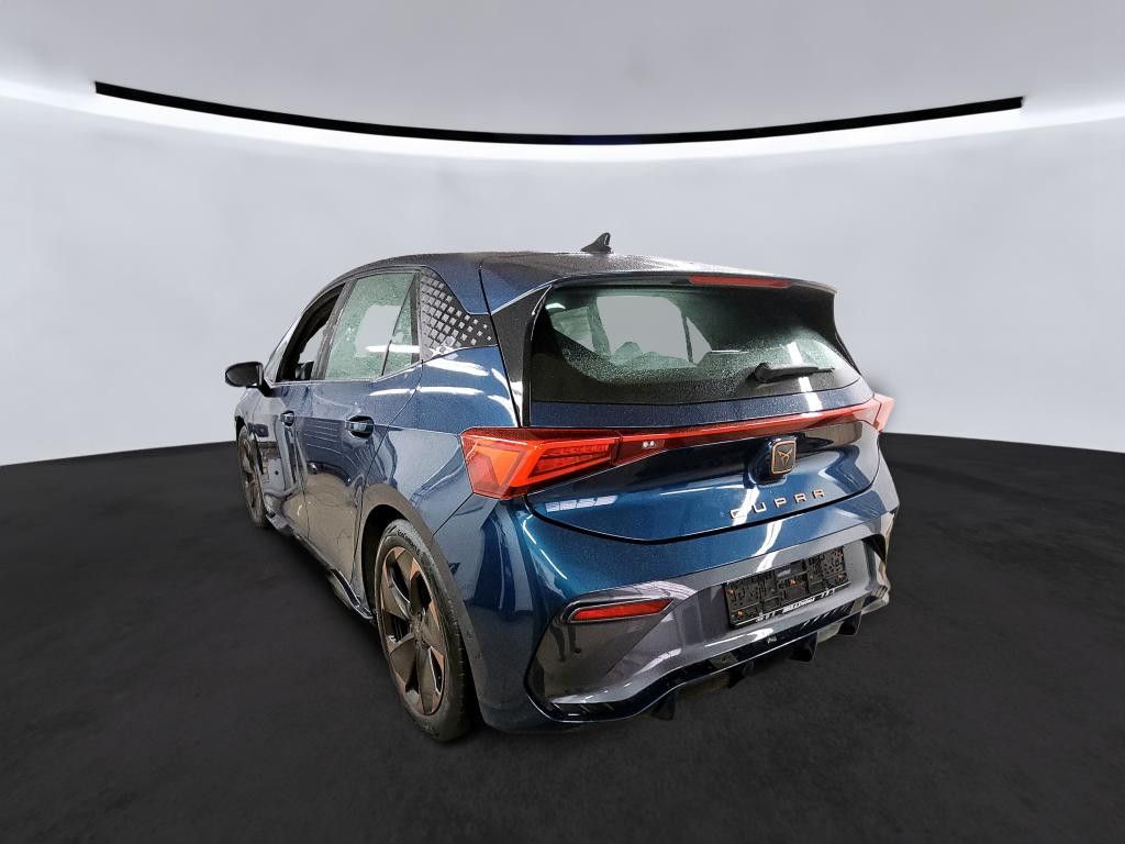 5 Lautsprecher, Airbag Beifahrerseite abschaltbar, Airbag Fahrer-/Beifahrerseite, Akustischer Fußgängerschutz, Außensound (e-sound / AVAS), Ambiente-Beleuchtung LED, Antriebs-Schlupfregelung (ASR), Audiosystem mit Touchscreen-Farbdisplay, Außenspiegel elektr. verstell-, heiz- und anklappbar mit Spiegelabsenkung und Welcome Light, Blinkleuchten LED in Außenspiegel integriert, Bluetooth-Schnittstelle mit Freisprecheinrichtung integriert, Dachhimmel schwarz, Einparkhilfe vorn und hinten, Elektromotor 150 kW (cont. 70 kW), Fahrassistenz-System: Fahrprofilauswahl (CUPRA Drive Profile), Fensterheber elektrisch vorn + hinten mit Komfortschaltung, Fußraumbeleuchtung LED, Geschwindigkeits-Begrenzeranlage, Heckleuchten Voll-LED mit Lichtband (Infinite Light), Heckspoiler Wagenfarbe (Dachspoiler), Heizungs-/Klimaanlage: Wärmepumpe, HV-Batterie 62 kWh brutto / 58 kWh netto, Innenspiegel mit Abblendautomatik, Isofix-Aufnahmen für Kindersitz an Beifahrersitz und Rücksitz (inkl. i-Size-Kindersitze), Karosserie: 5-türig, Klimaanlage Climatronic 2-Zonen, Kombiinstrument digital (virtual cockpit), Kopf-Airbag-System, Notrufsystem, Parkbremse elektrisch, Pedale Aluminium-Design, Rücksitzlehne geteilt/klappbar (1/3-2/3), Schnellladevorrichtung (CCS-Ladedose), Schriftzug auf der Heckklappe, Seitenairbag, Seitenairbag vorn mitte (Central Airbag), Sitz vorn links höhenverstellbar, Sitzbezug / Polsterung: Stoff, Sonnenblende links mit Spiegel (beleuchtet), Sonnenblende rechts mit Spiegel (beleuchtet), Sport-Schalensitze vorn mit integrierten Kopfstützen, USB-Ladeanschlüsse (2-fach, Typ C) für 2.Sitzreihe, Warnanlage für Sicherheitsgurt-System, Wärmeschutzverglasung